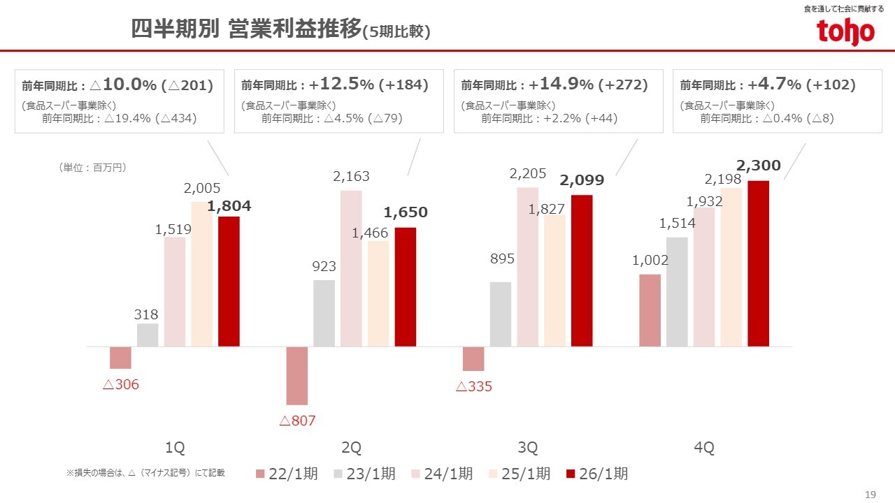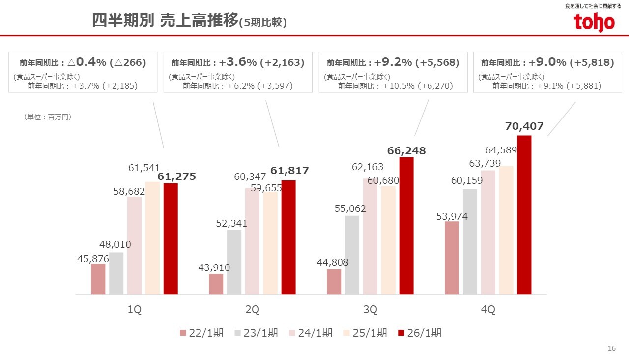 食品スーパー事業からの撤退の影響があった第1四半期は減収となりましたが、国内ディストリビューター事業の堅調な推移などにより、第2四半期以降は各四半期ともに増収で着地しました。