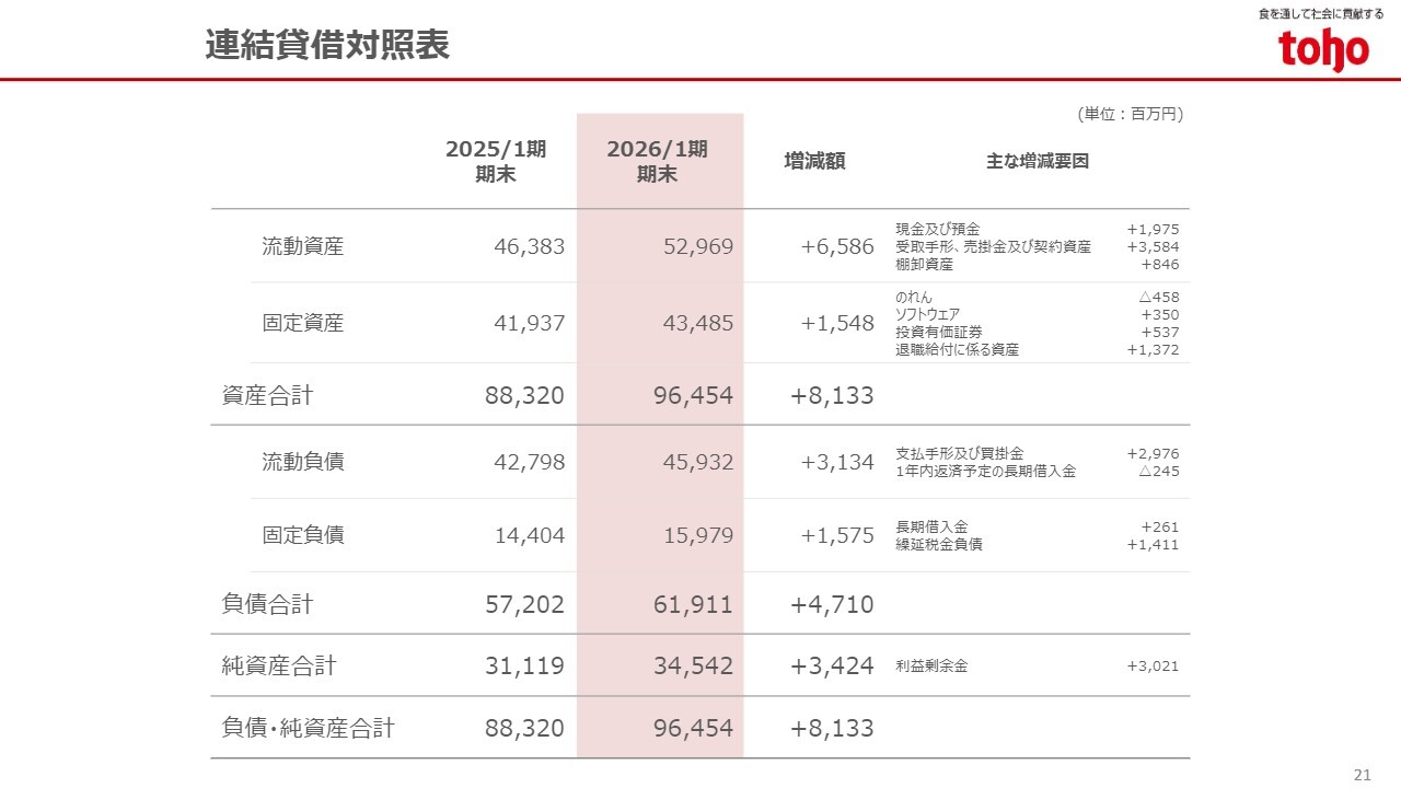 資産合計は964億5,400万円となり、前期末と比べ、81億3,300万円増加しました。主な要因は、売上の拡大や三協食鳥のグループ入りなどにより、売掛金や棚卸資産が増加したことによるものです。