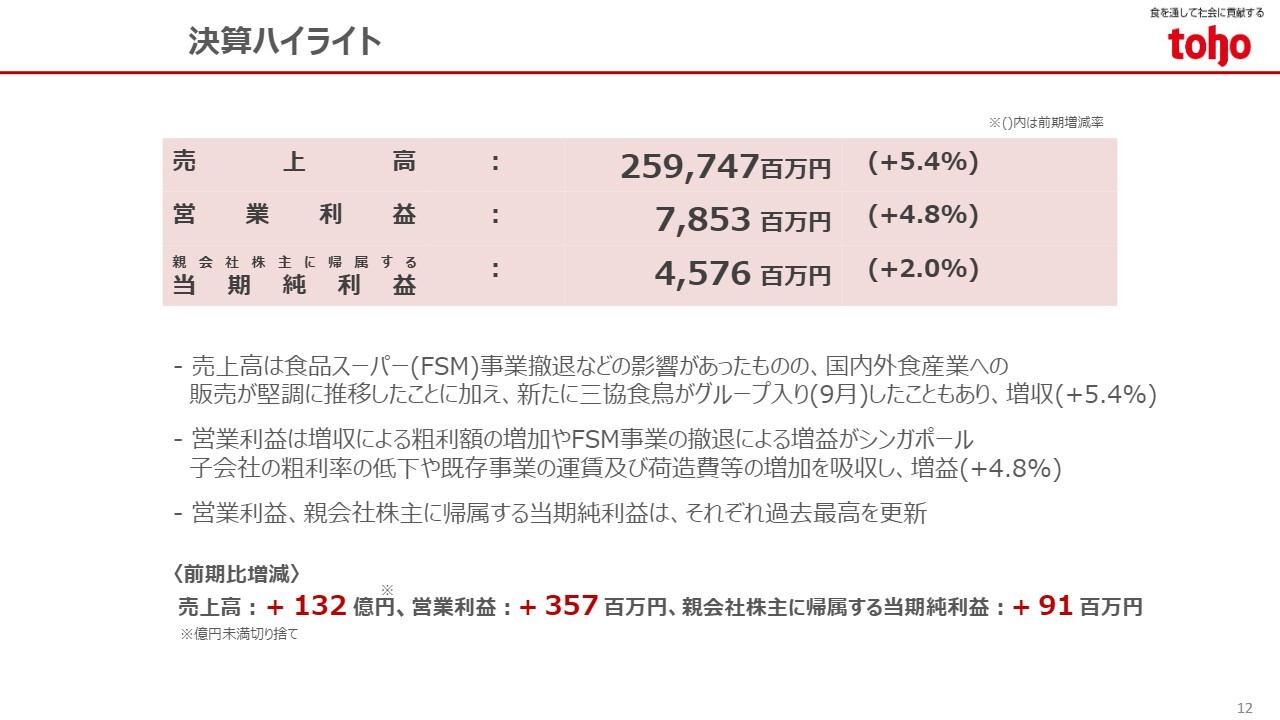 売上高は2,597億4,700万円で、前期比5.4パーセント増となりました。前期の11月に食品スーパー事業から撤退した影響はありましたが、インバウンド需要の活況などを背景に、国内の外食産業向けの販売が堅調に推移しました。また、新たに三協食鳥がグループ入りしたことも寄与し、増収となりました。