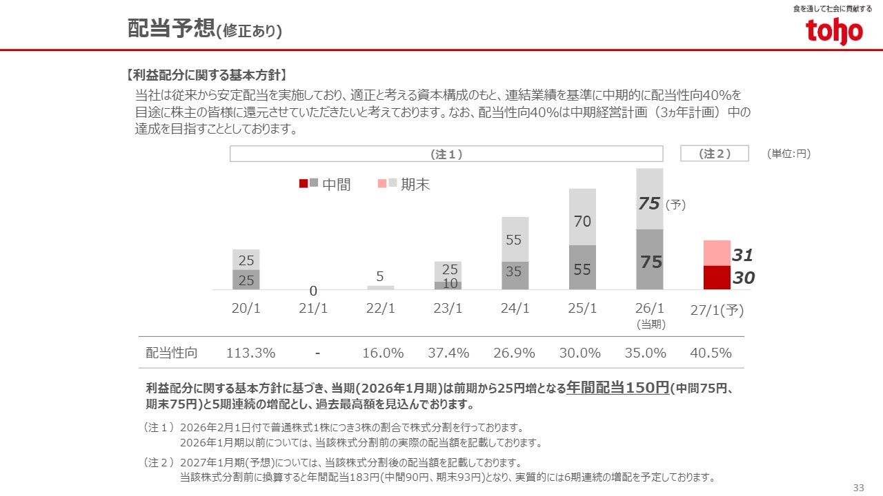 また、現中期経営計画では、最終年度である2027年1月期までに配当性向40パーセントを目指すことを掲げていますが、計画どおり進捗した場合には、40.5パーセントとなる見込みです。