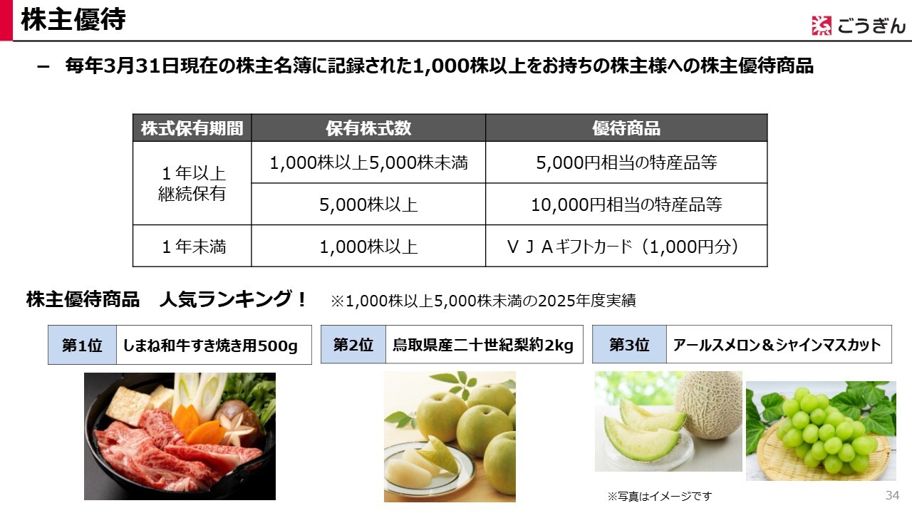 例えば、5,000株以上の株式を1年以上継続して保有いただくと、1万円相当の特産品などを選べるカタログギフトをお送りしています。カタログギフトの人気ランキングはスライドをご覧のとおりで、「しまね和牛すき焼き用500g」は3年連続第1位と大変好評です。