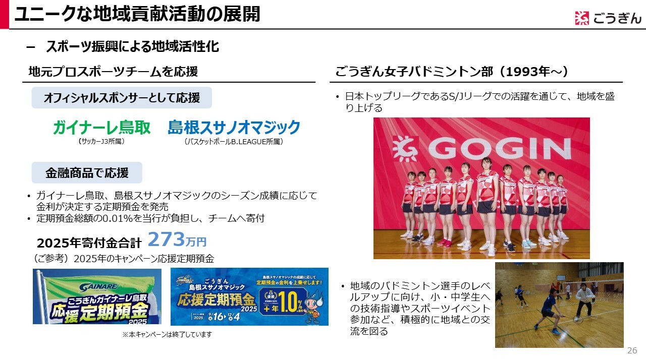 スライド右側では、当行の女子バドミントン部についてご紹介しています。日本トップリーグであるS/Jリーグで戦うことに加え、地域のバドミントン選手のレベルアップを目指し、小・中学生への指導などを通じて積極的に地域との交流を図っています。