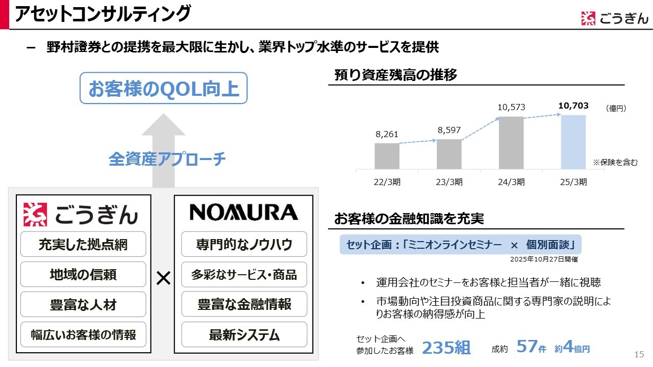 また、個人のお客さまの資産運用などを行うアセットコンサルティング分野では、野村證券との提携により、業界トップ水準のサービスを提供しています。