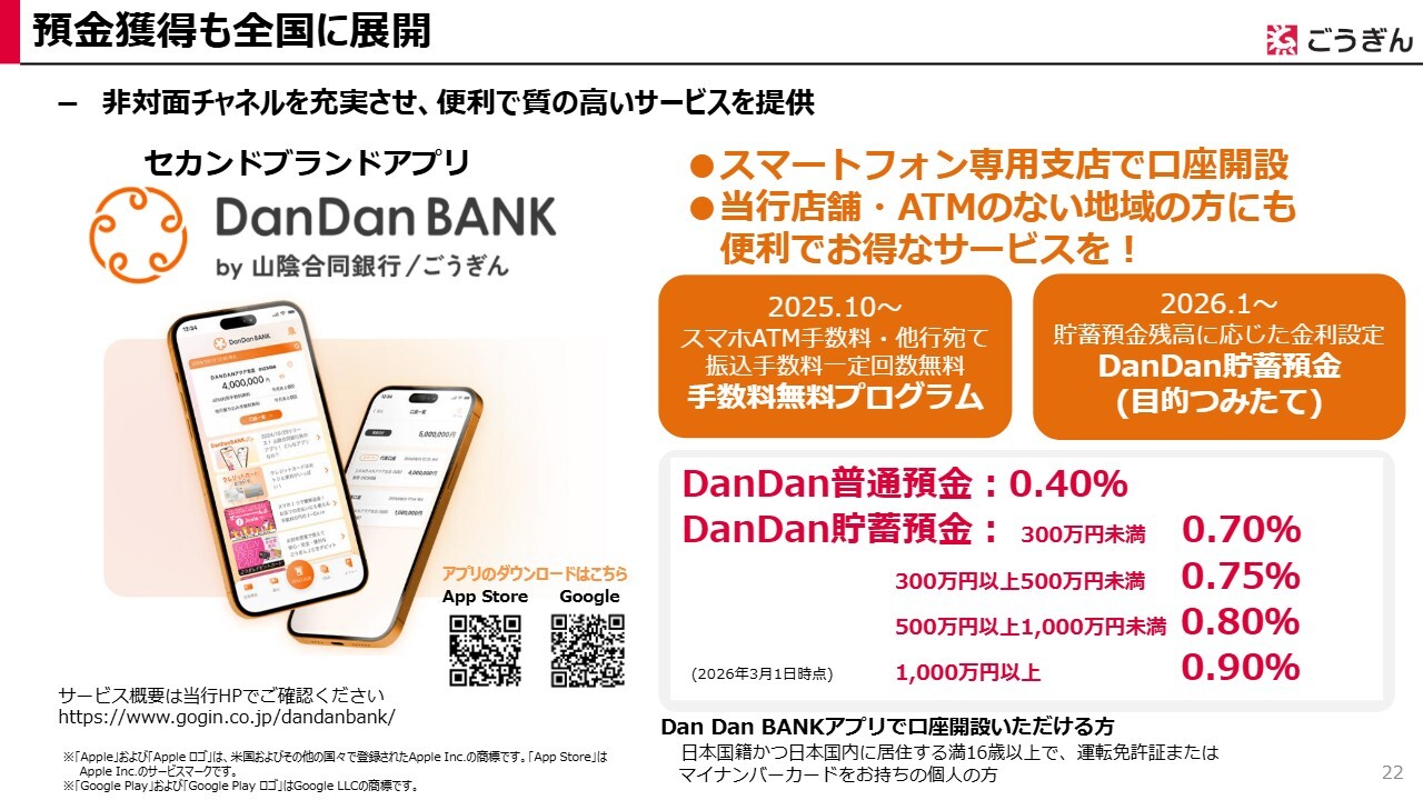さらに、説明の中でも少し触れましたが、デジタルを活用したセカンドブランドアプリ「DanDanBANK」を展開しています。このアプリでは、全国からデジタルを通じて預金を集める仕組みを整備しており、よりお客さまに訴求力のある、魅力的な預金商品を今後も展開していきたいと考えています。