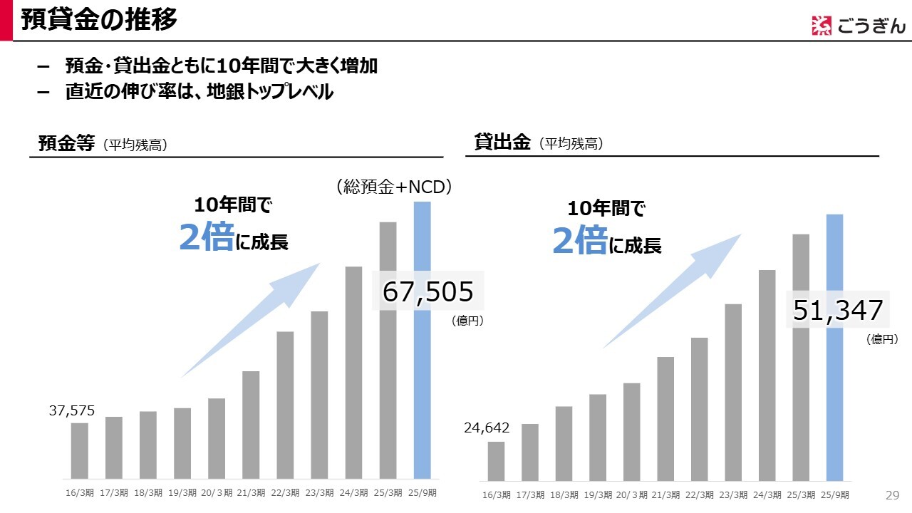 スライドに、預金・貸出金の過去10年間の平均残高の推移を示しています。2025年9月期における預金等の平均残高は6兆7,505億円、貸出金の平均残高は5兆1,347億円となり、いずれも10年前と比較して約2倍に成長しました。特に貸出金の直近の伸び率は、地方銀行の中でトップレベルの水準です。