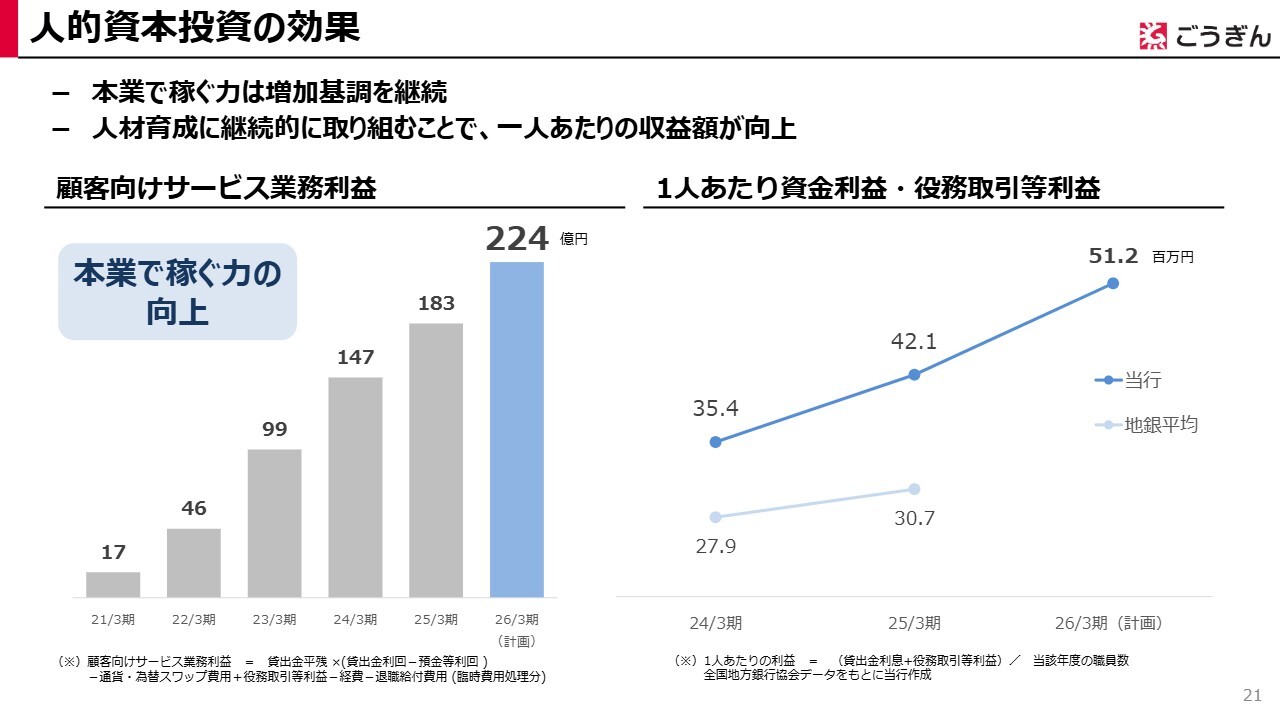 人的資本投資の効果についてご説明します。これまでお伝えしたとおり、当行は成長の原動力である人材への積極的な投資を続けた結果、本業で稼ぐ力が確実に向上しています。