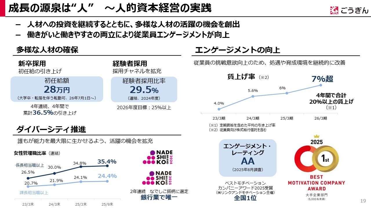 ダイバーシティ&インクルージョンの観点では、誰もが能力を最大限発揮できるよう、活躍の機会をさらに拡大しています。女性登用については、2025年9月末時点で係長相当以上の女性割合が35.4パーセント、支店長職以上が24.4パーセントと年々上昇しています。