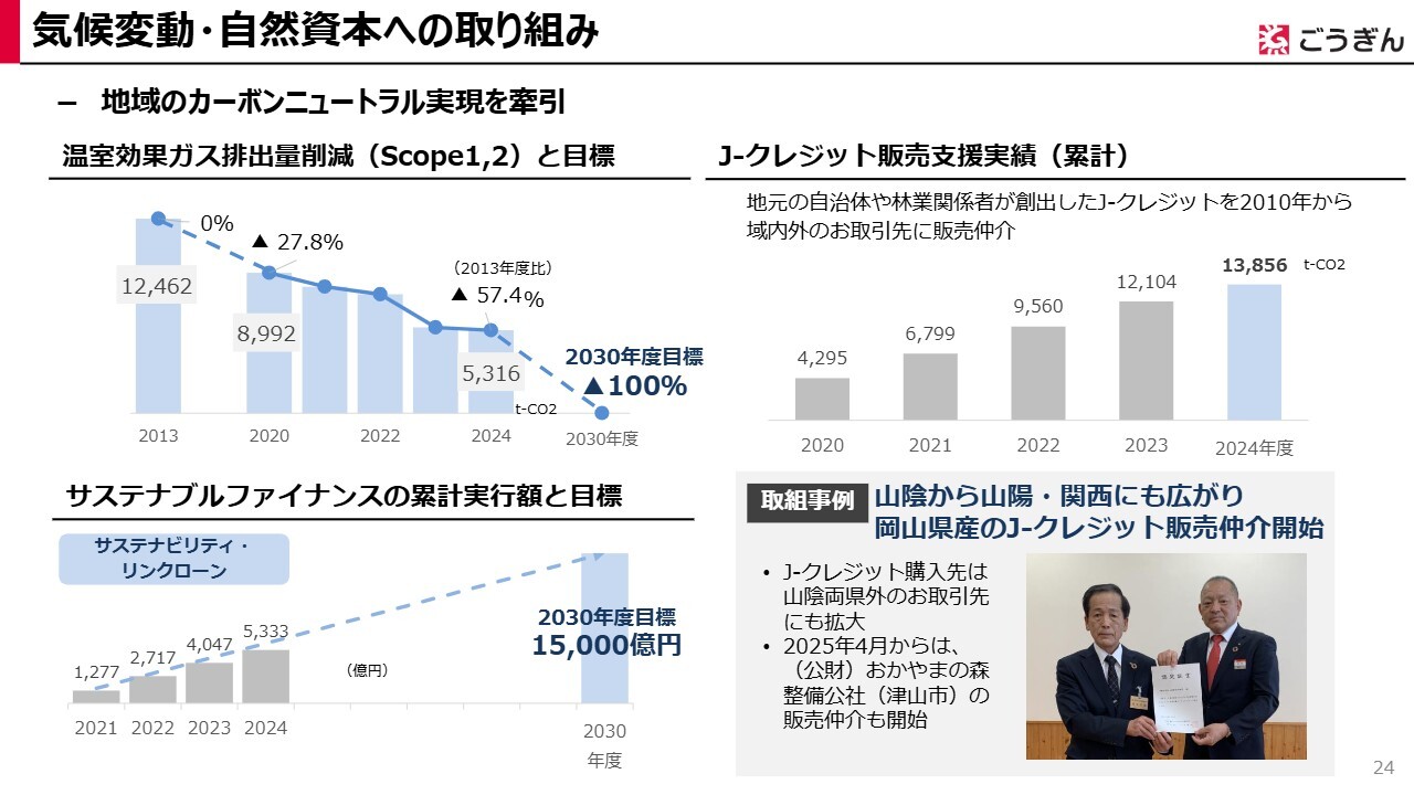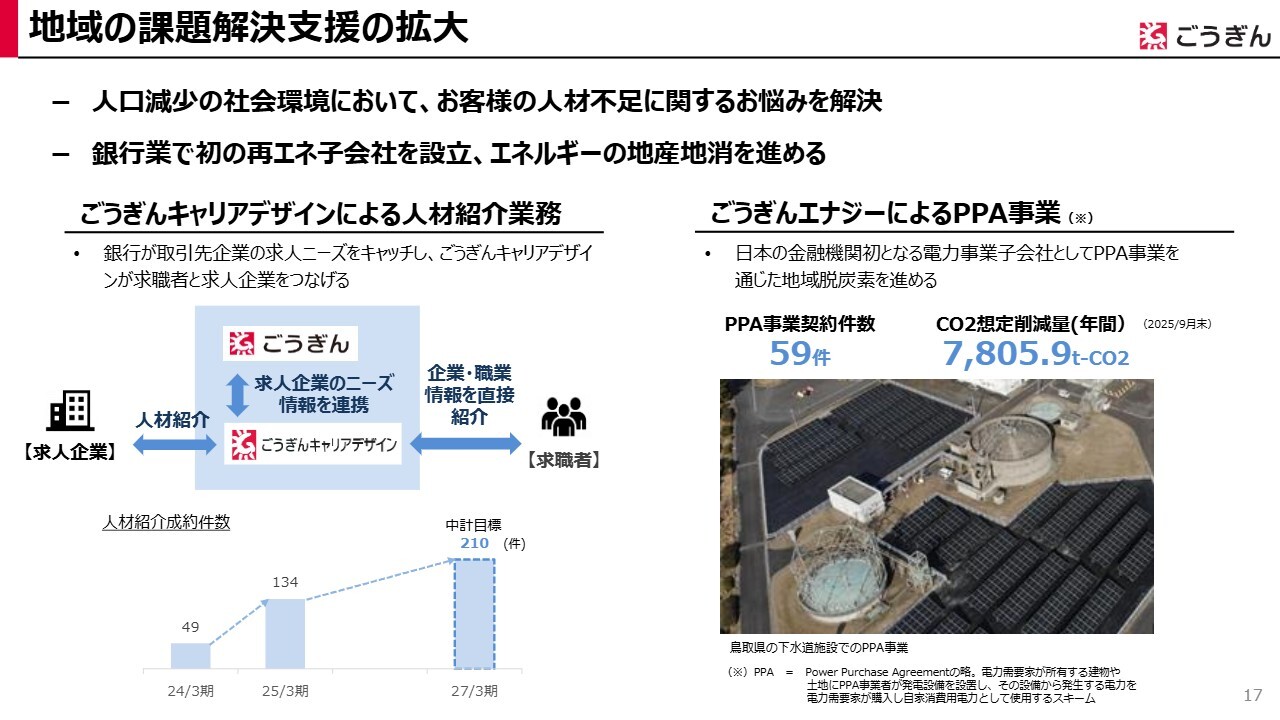 人手不足解消への対応はごうぎんキャリアデザインが担い、2025年3月期には134件の紹介が成約に至りました。また、ごうぎんエナジーが手掛けるPPA事業を通じて地域脱炭素を進め、2025年9月末には年間想定で約7,800トンのCO2を削減することができました。