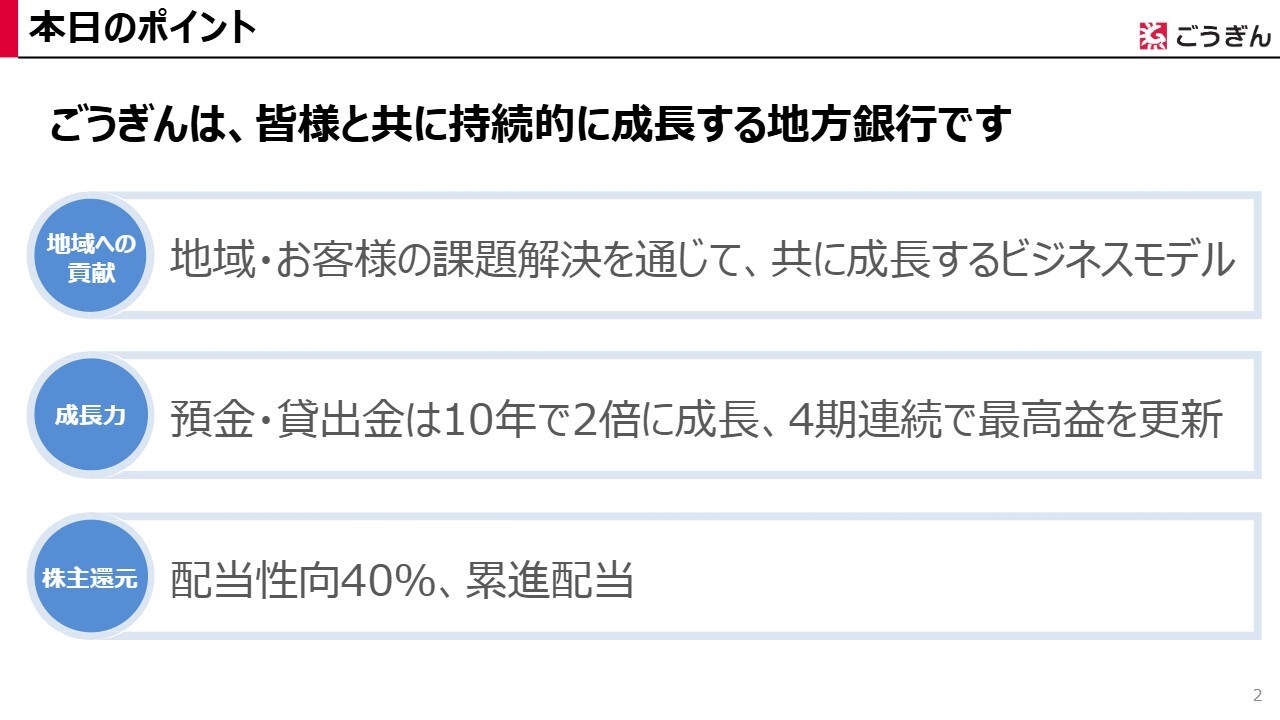 まず、本日のお話のポイントを3つお伝えします。1つ目は、当行は地域やお客さまの課題解決を通じて、ともに成長していくことをビジネスモデルとしていることです。