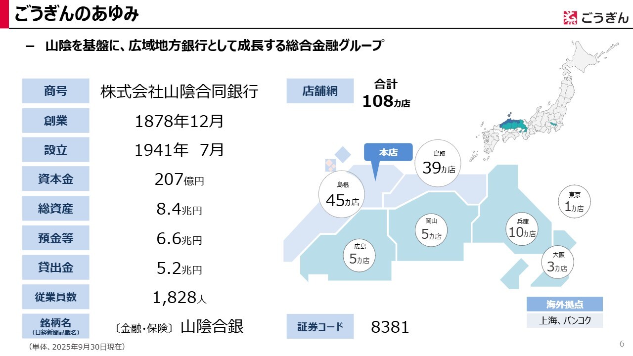 当行のあゆみについてご説明します。当行は1878年、約150年前に島根県西部で創業した山陰を基盤とする広域地方銀行であり、現在では山陰、山陽、関西、東京に108店舗を展開しています。