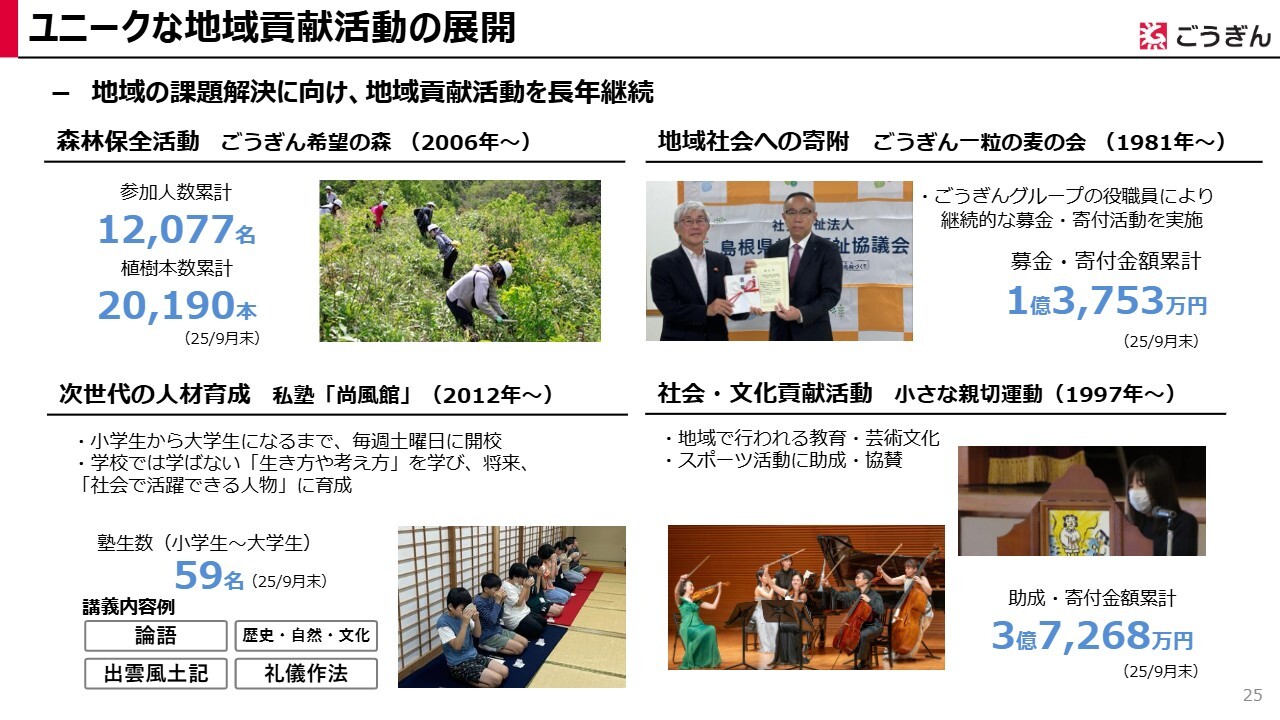 ユニークな社会貢献活動についてご紹介します。島根県・鳥取県での「森林保全活動」、江戸時代の藩校をイメージした私塾「尚風館」、当行グループの役職員から募金を集めて子ども食堂などへ寄付を行う「ごうぎん一粒の麦の会」など、当行独自の活動をご紹介しています。