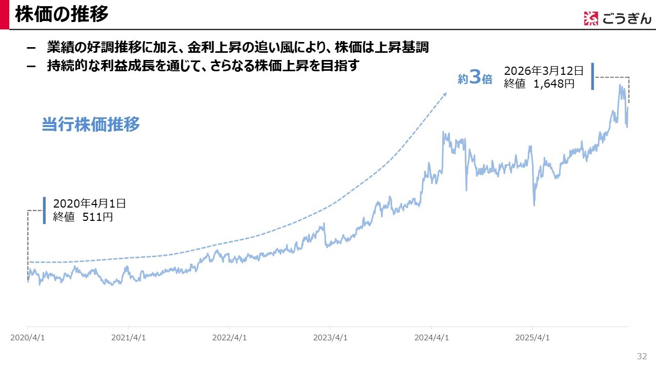 先ほど業績ハイライトや預金・貸出金の伸びの状況についてお話ししたとおり、当行は本業を中心に増収・増益を続けています。ここに昨今の金利上昇の追い風も加わり、株価は上昇基調にあります。