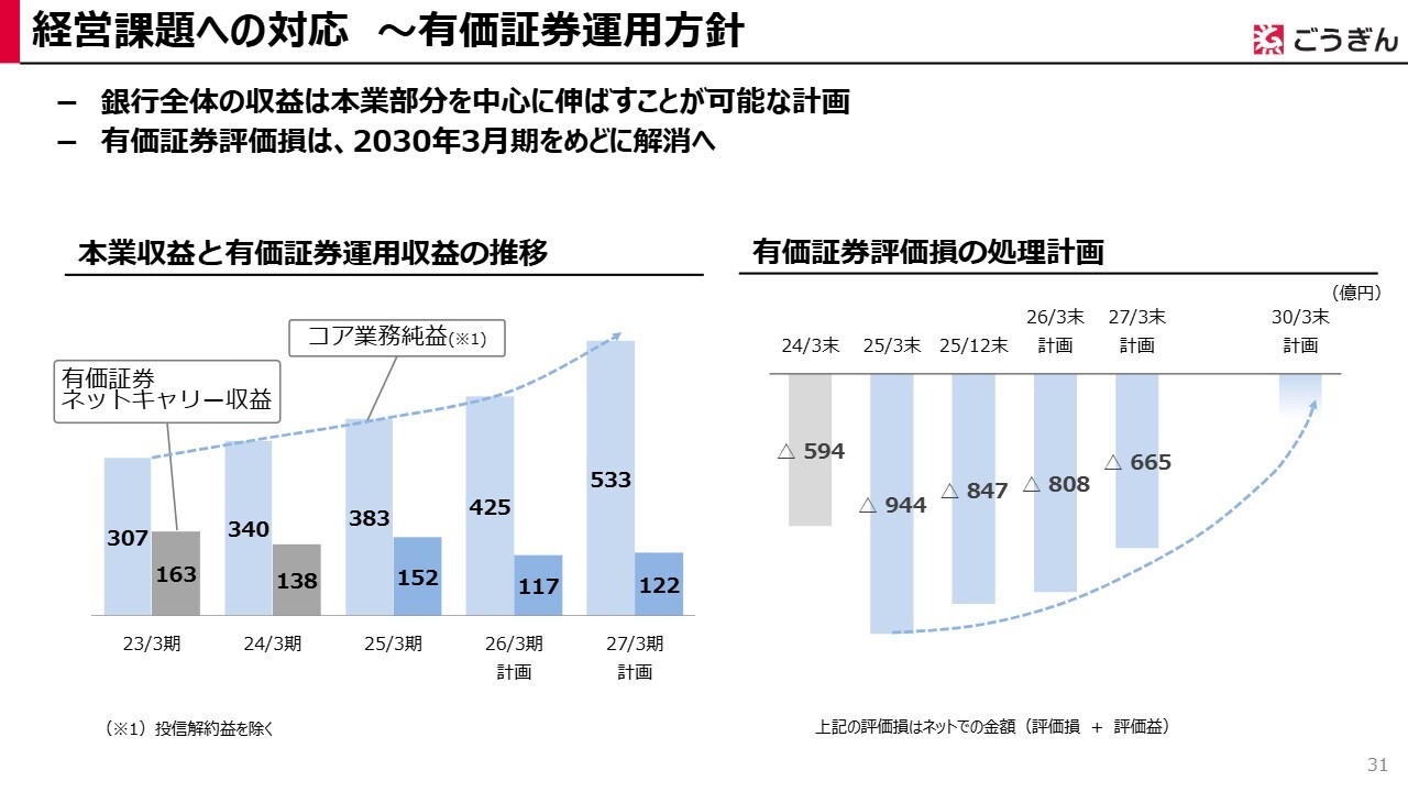 一方で、有価証券については、現在多くの含み損を抱えている状況です。これについては、毎年一定の含み損処理を計画的に進めているほか、金利系の債券が有価証券の中心となっているため、その経年効果も含め、5年後を目途に含み損をゼロに近づけられるという見通しを持っています。