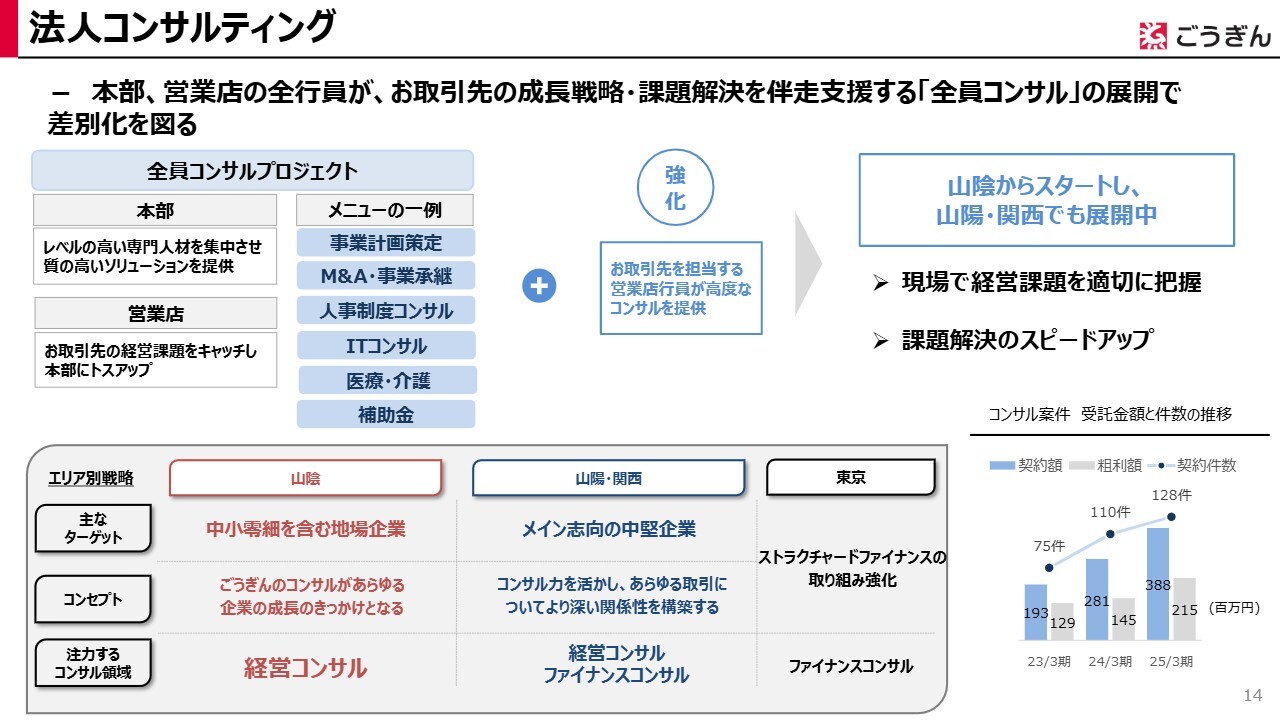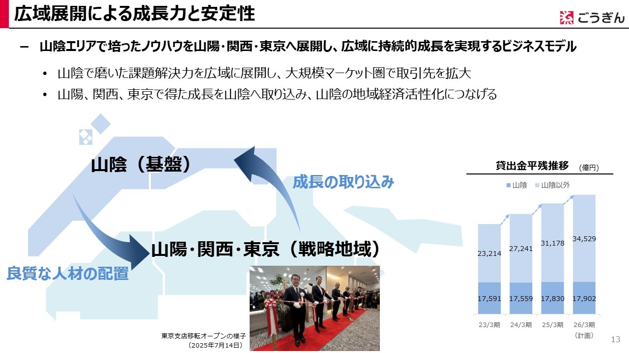 また、山陽、関西、東京においては、これまで法人向けコンサルティングを通じた法人貸出金の増強を目指して営業を展開してきました。そこで培われた法人取引などにより、法人預金やその法人の取引先の従業員のみなさまの個人預金の獲得を強化していきたいと考えています。