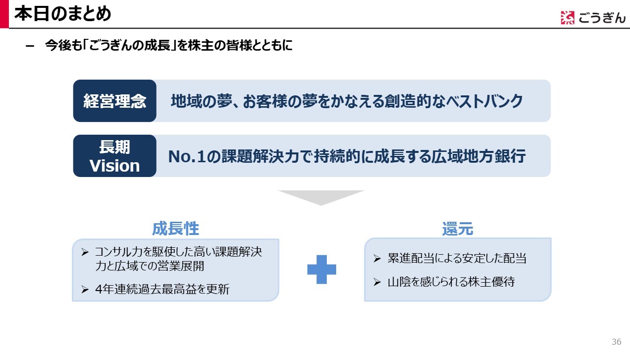 最後に、本日のまとめです。私は、当行の強みは「成長性」と「還元」にあると考えています。お客さまに信頼され、選ばれ続けることで、地域・お客さまと当行がともに成長し、利益を株主のみなさまにしっかりと還元することで、株主のみなさまからも選ばれる銀行であり続けたいと考えています。