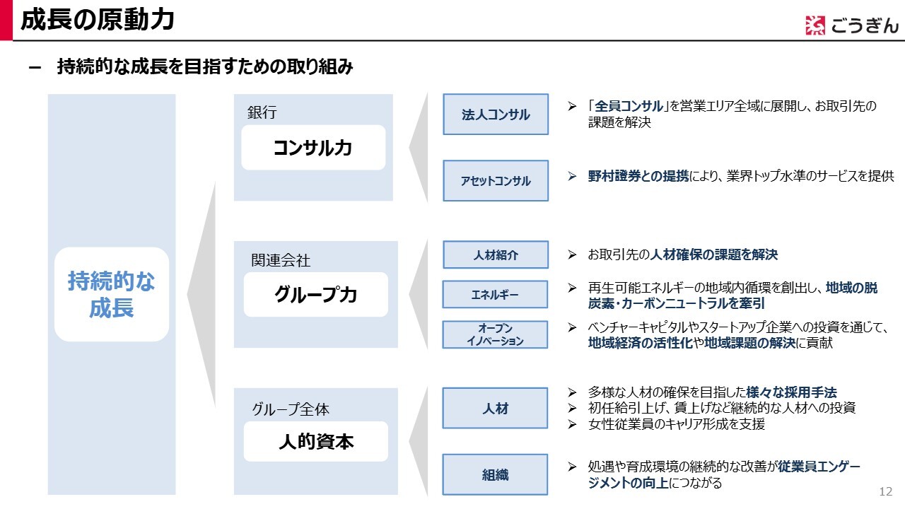 3つ目は、グループ全体の「人的資本」です。当行の成長の原動力は「人材」にあります。多様な人材がそれぞれの能力を最大限に発揮することが、地域やお客さまの課題解決および成長につながり、ひいては当行の成長へと結びついていきます。