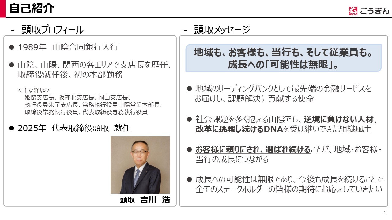 吉川浩氏(以下、吉川):みなさま、本日はお忙しいところ、株式会社山陰合同銀行の個人投資家さま向け会社説明会にご参加いただき、誠にありがとうございます。代表取締役頭取の吉川です。