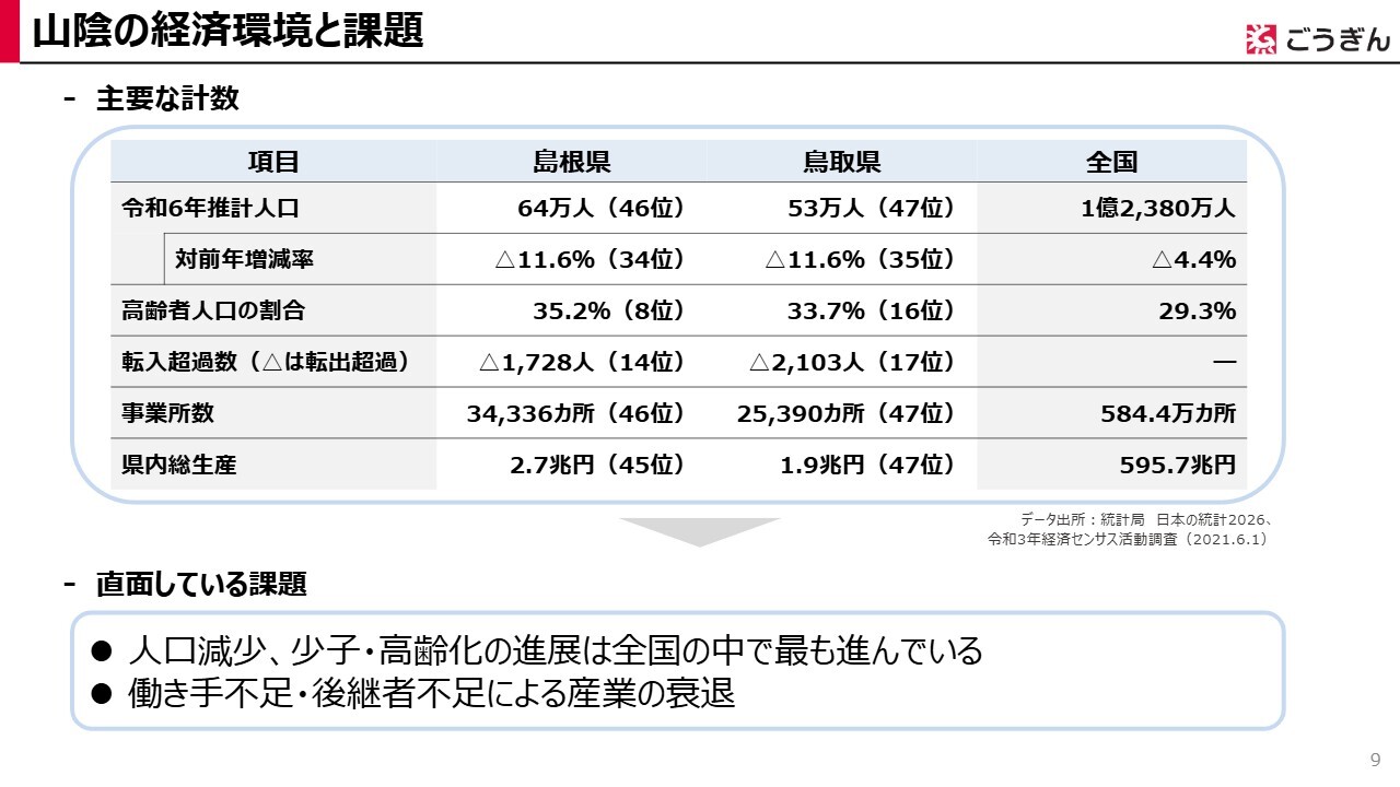 スライドをご覧のとおり、島根県・鳥取県は人口、事業所数、県内総生産が47都道府県の中で最下位であり、人口規模、経済規模は両県を合わせても全国の1パーセントに届きません。人口減少や少子・高齢化が進行しており、働き手不足や後継者不足が地域産業の経営課題となっています。