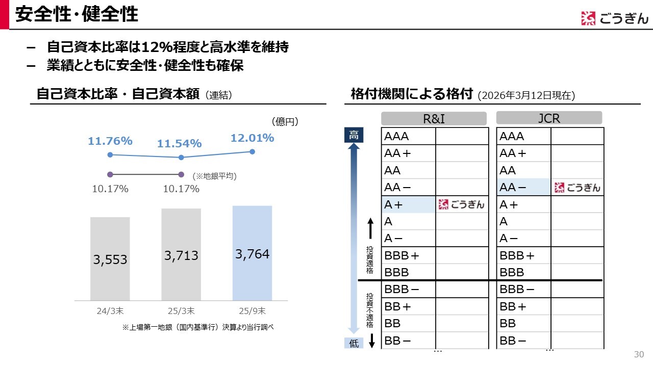 当行の安全性・健全性の状況についてご説明します。2025年3月末の自己資本比率は11.54パーセント、2025年9月末の自己資本比率は12.01パーセントとなりました。