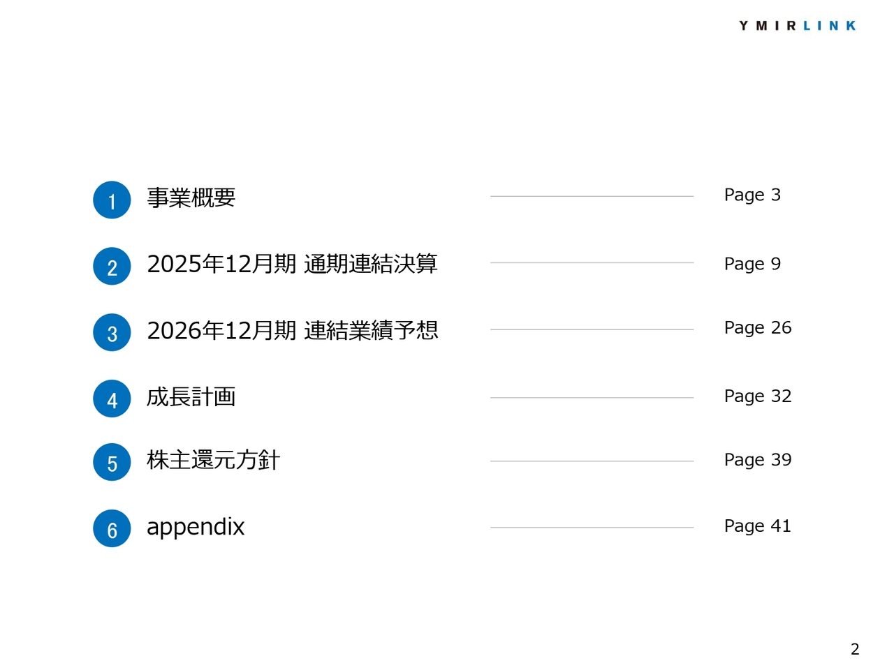清水亘氏(以下、清水):みなさま、本日はご参加いただきありがとうございます。ユミルリンク株式会社代表取締役社長の清水です。それでは2025年12月期通期決算についてご報告します。資料の構成はスライドのとおりです。