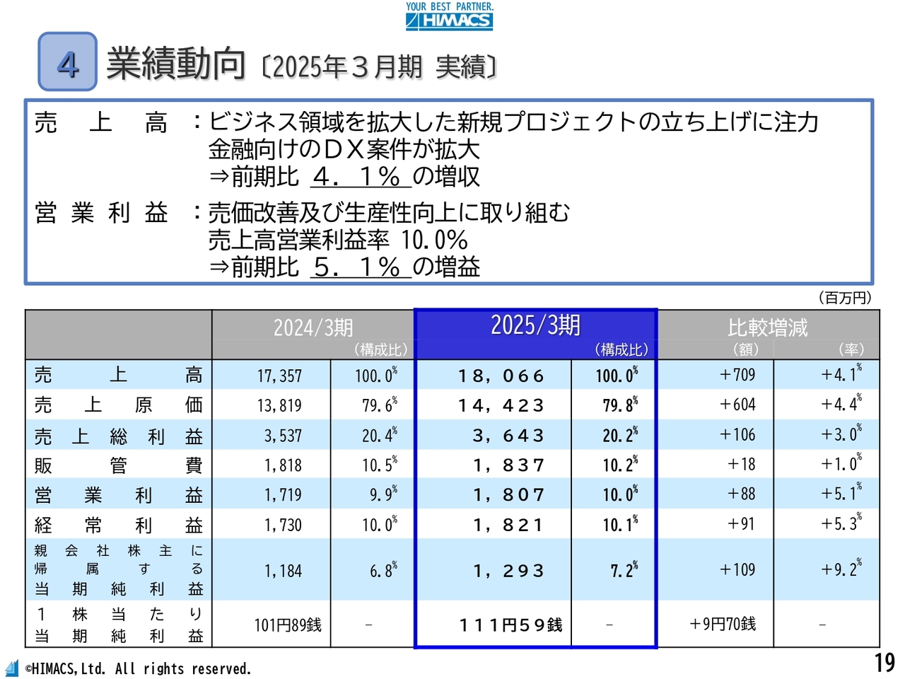 営業利益については、売価の改善および生産性向上に取り組んだ結果、18億700万円となり、前期比5.1パーセントの増益を達成しました。売上高営業利益率は10パーセントです。