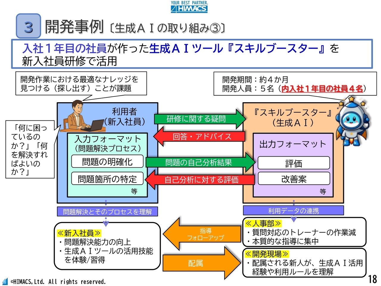 中島:3つ目は、生成AIツール「スキルブースター」を新入社員研修で活用した事例です。「スキルブースター」は新入社員の問題解決能力向上を目的として開発され、研修における質問対応や問題解決支援を行います。