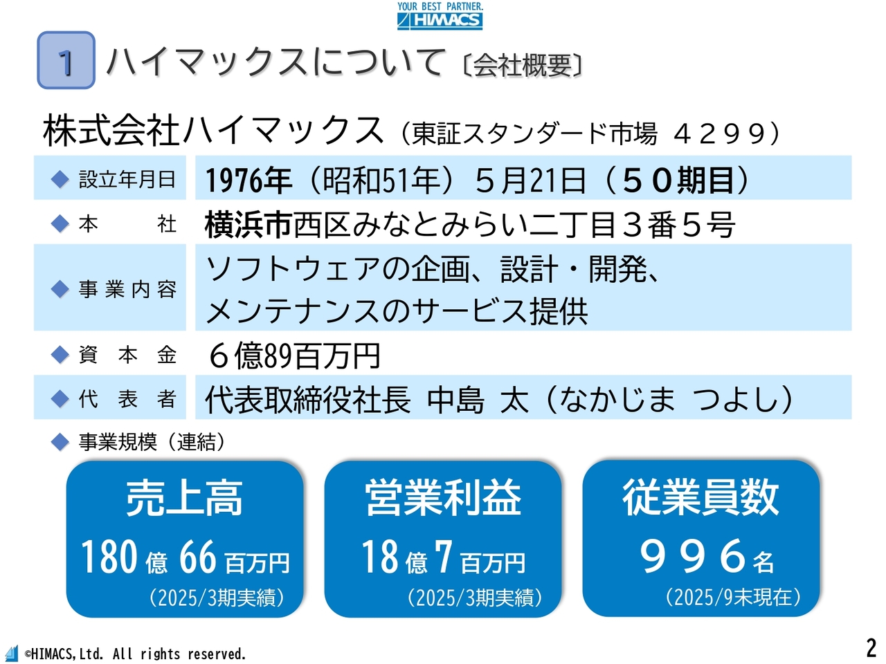中島:会社概要です。当社は1976年に設立し、本社は設立以来横浜にあります。今年度で第50期を迎えました。