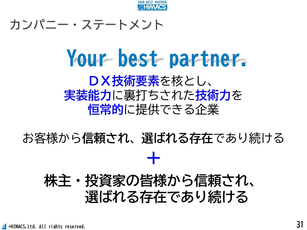 中島:当社のカンパニーステートメントは「Your best partner.」です。DX技術要素を核に、実装能力に裏打ちされた技術力を恒常的に提供できる企業として、お客さまから信頼され、選ばれる存在であり続けることが当社の存在意義であると考えています。