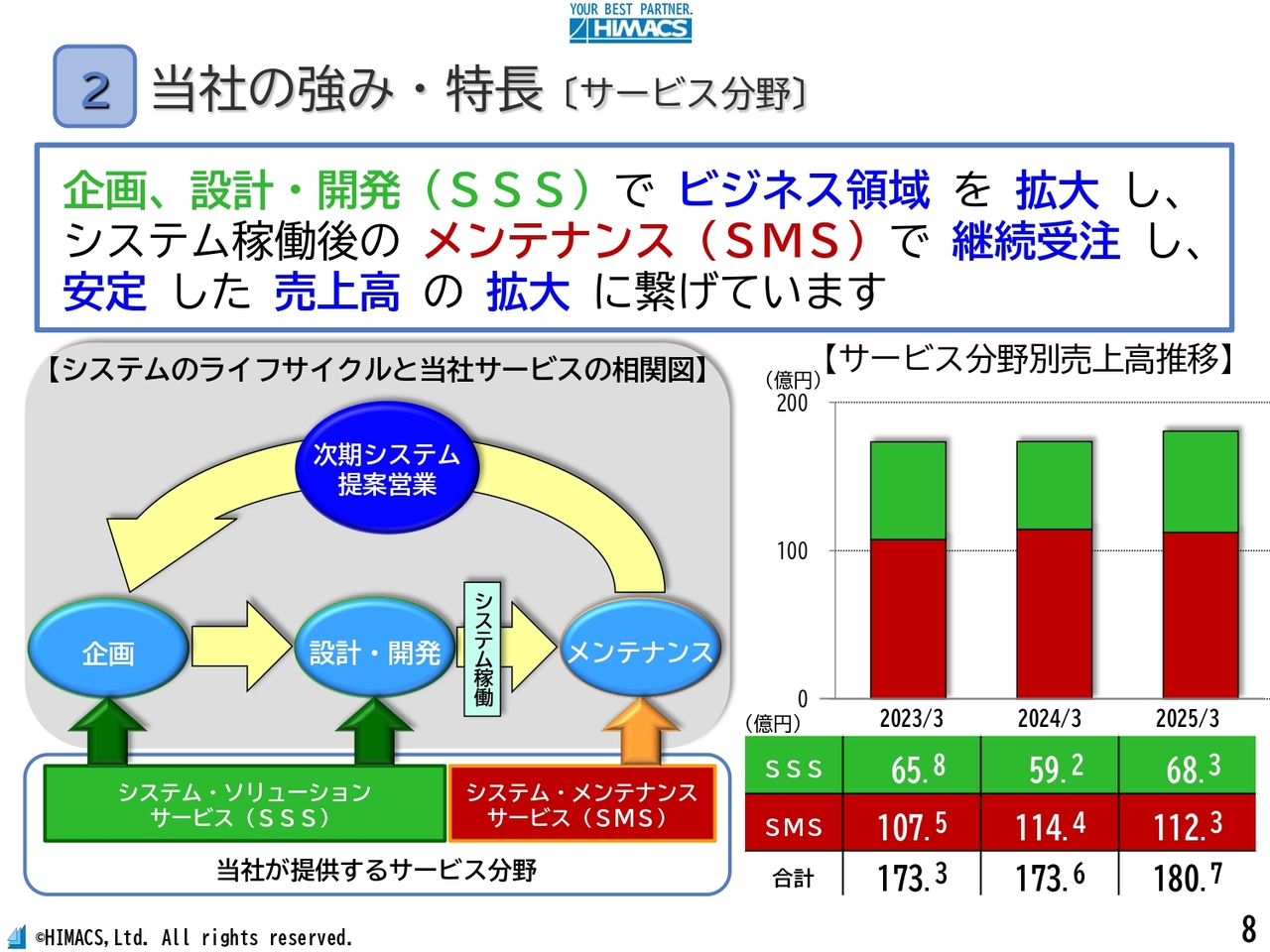 企画および設計・開発(SSS)の工程で領域を拡大し、システム稼働後のメンテナンス(SMS)で継続受注することにより、安定した売上高の拡大につなげています。