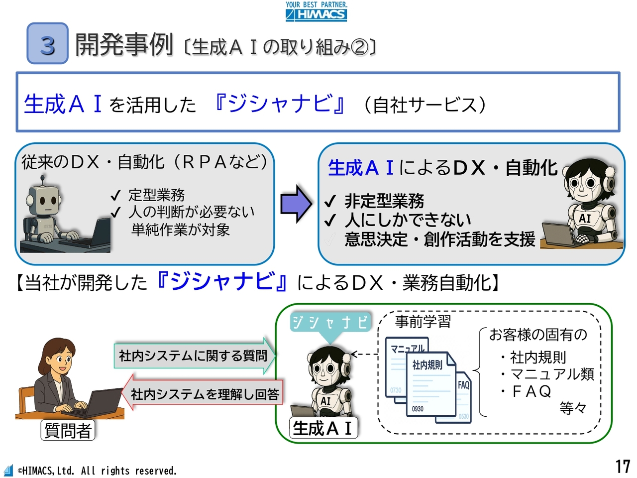 当社が開発した「ジシャナビ」は、お客さま固有の社内規則やマニュアルなどを事前に学習させることで、例えば社内システムの利用方法に関するご質問に、わかりやすく回答します。
