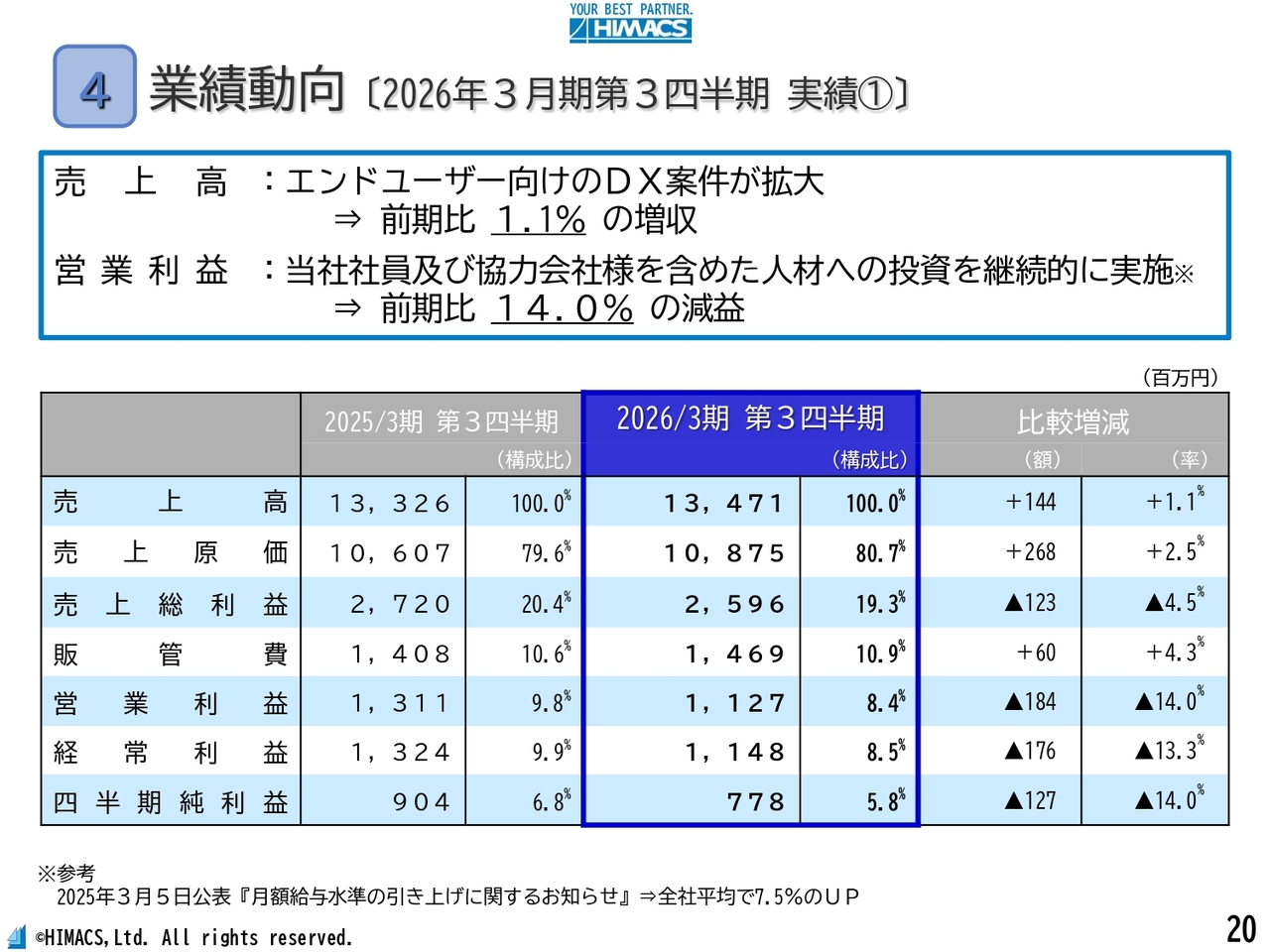 今期は自社で平均7.5パーセントのベースアップと協力会社に対する単価アップによる人件費を引き上げたため、利益率を圧迫していますが、当社は公正取引委員会の価格適正化の指導をもとに売価改善の交渉を粘り強く継続していきます。