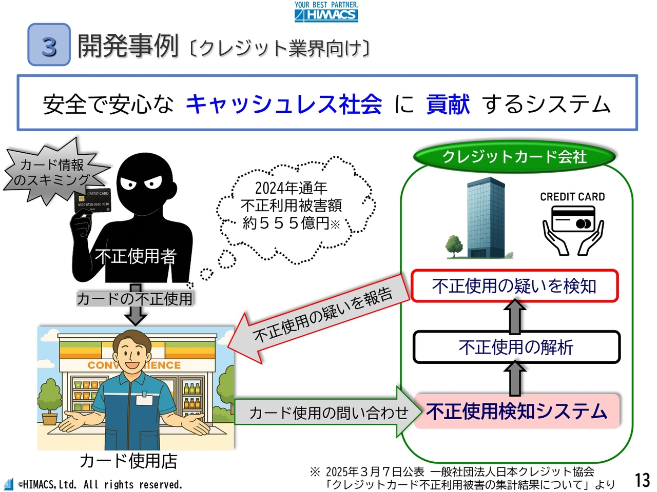中島:次に、クレジットカード不正利用対策についてです。クレジットカードの偽造などによる不正使用は年間約555億円以上に達しており、クレジット会社にとって重要な経営課題となっています。