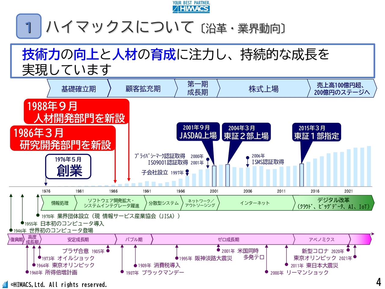 中島:スライドには、情報サービス産業の歩みと社会情勢、当社グループの売上高の推移を示しています。