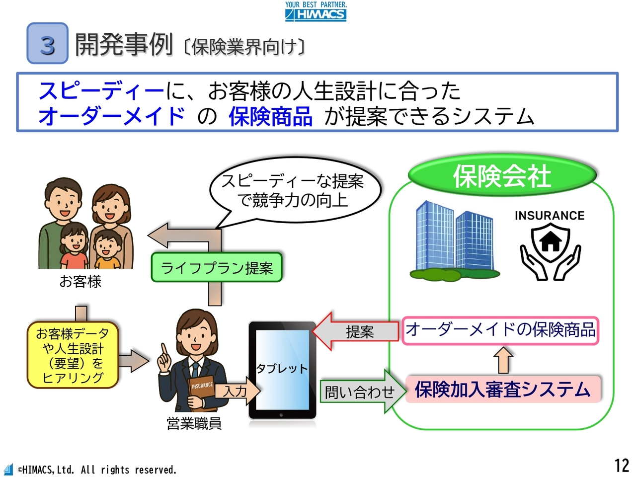 スピーディーにオーダーメイドの提案が可能になることで、保険会社の業務効率化および競争力向上を支援しています。