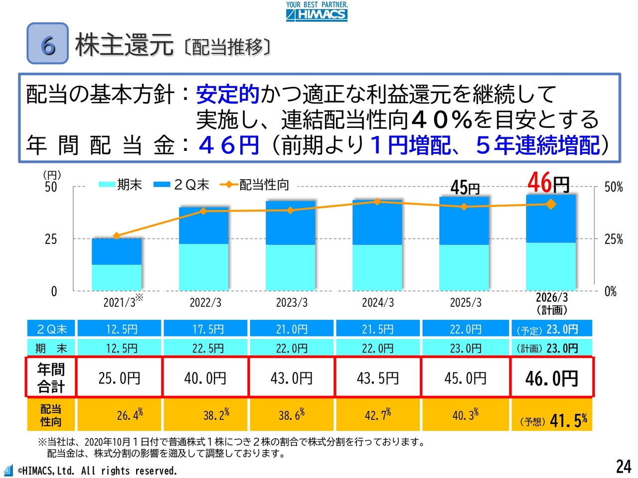 2点目は、「安定かつ適正な株主還元の継続」をベースに、事業の成長と収益性・内部留保のバランスを取りながら、業績に応じて、柔軟かつ機動的な還元を継続していきます。