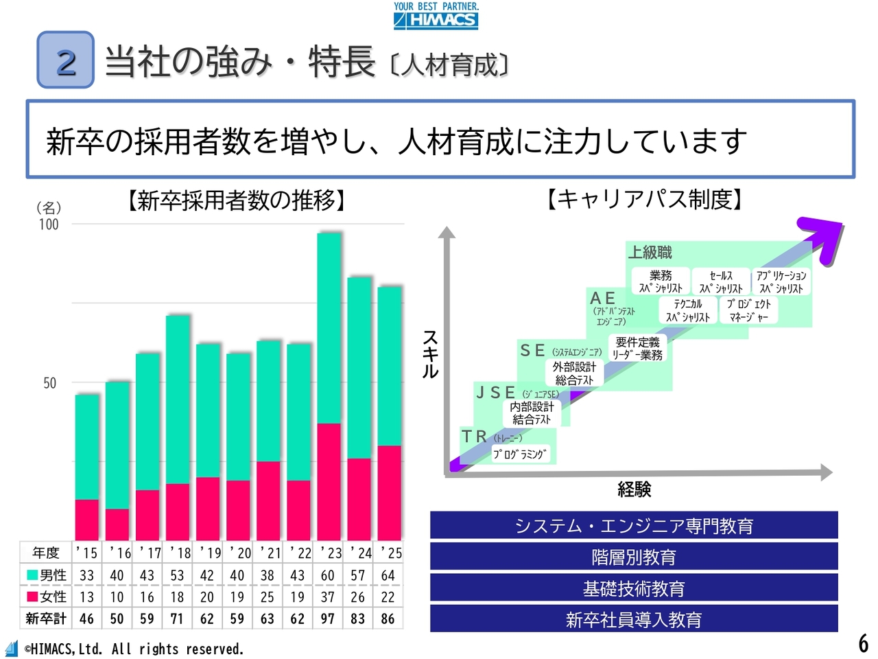 1つ目は、人材育成です。近年の技術者不足への対応として、新卒採用人数を従来の50名程度から、直近では連結ベースで約80名まで増加させました。当社の資本である人材の増強に積極的に取り組んでいます。