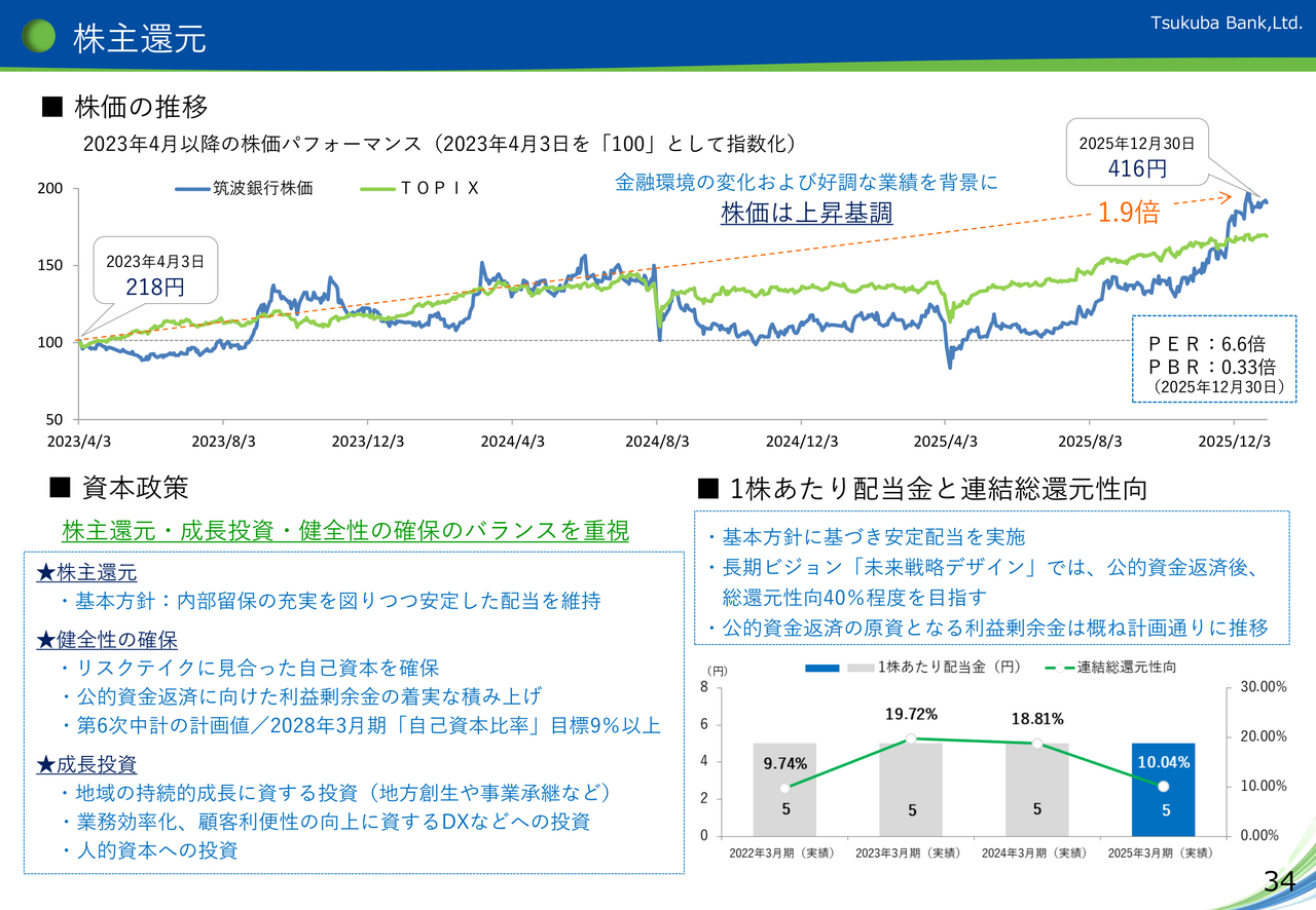 34ページの上の図は、2023年4月から2025年12月末までの当行の株価(青色)とトピックス(緑色)の値動きとなります。資料記載のように当行の株価はこの2年半で約1.9倍の水準まで上昇し、1月に入ってからも上昇を続けています。