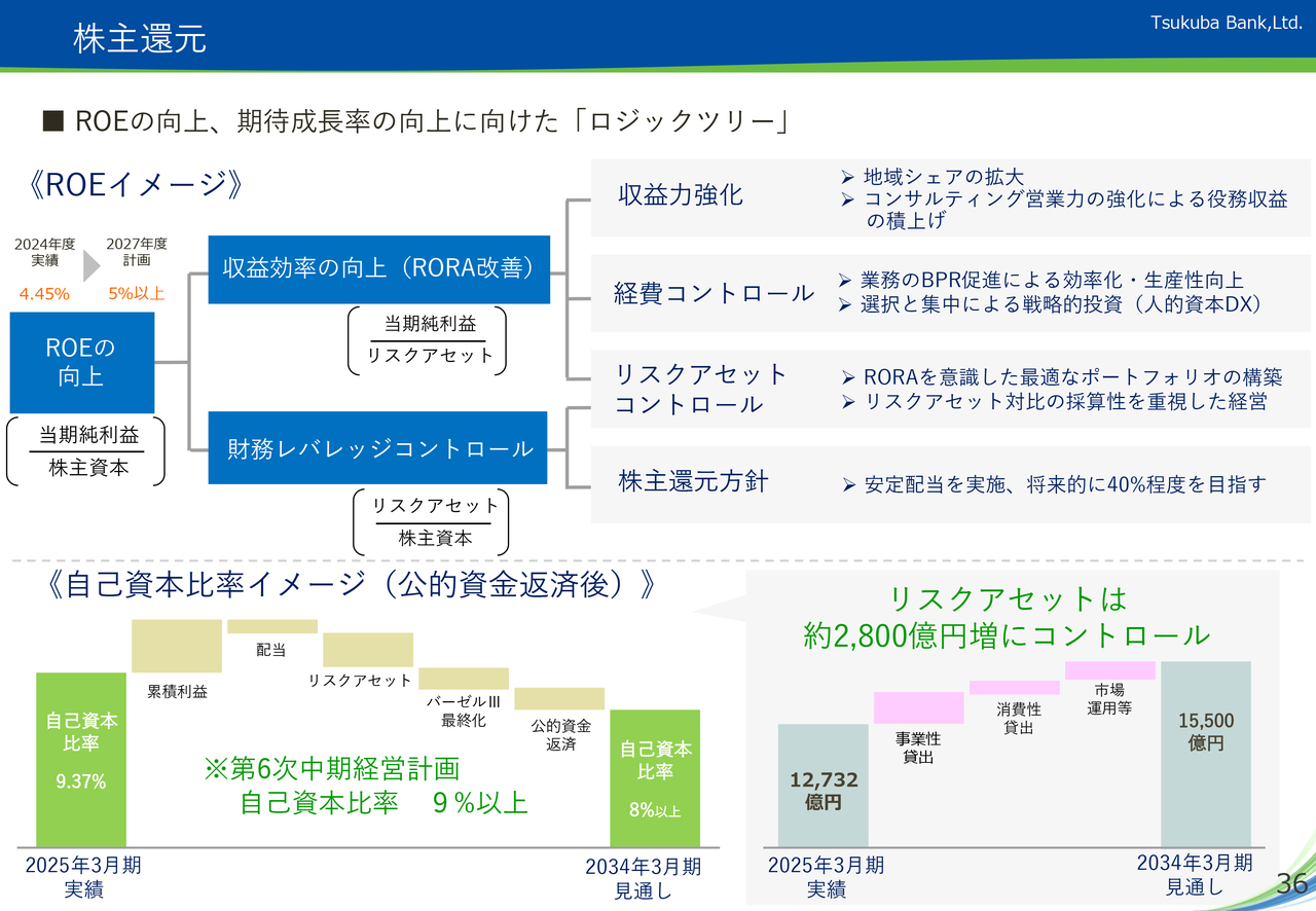 当行の資本政策や株主還元方針は資料記載のとおりですが、株主さまへの還元と持続的な成長に向けた戦略的投資、公共性の高い銀行業としての健全性を維持するための適正な自己資本水準の確保とのバランスをとりながら対応していきます。