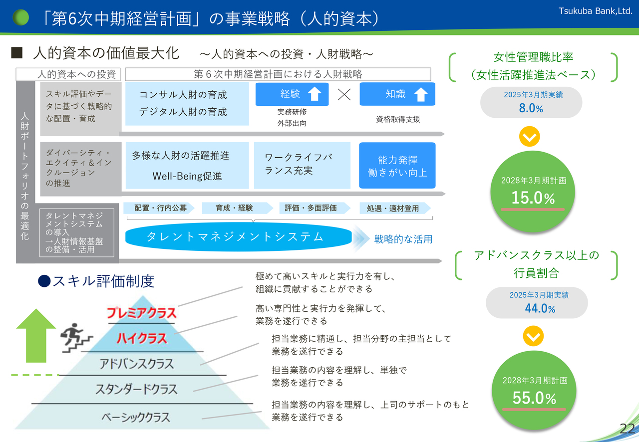 加えて、資料下段記載のように、「スキル評価制度」を活用した人財の把握とレベルに応じた育成強化に努め、行内外の研修等を経験させながら、業務に精通した「アドバンスクラス」以上の行員割合を55パーセントまで引き上げます。