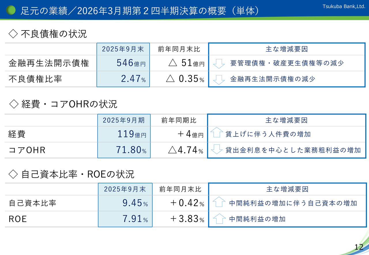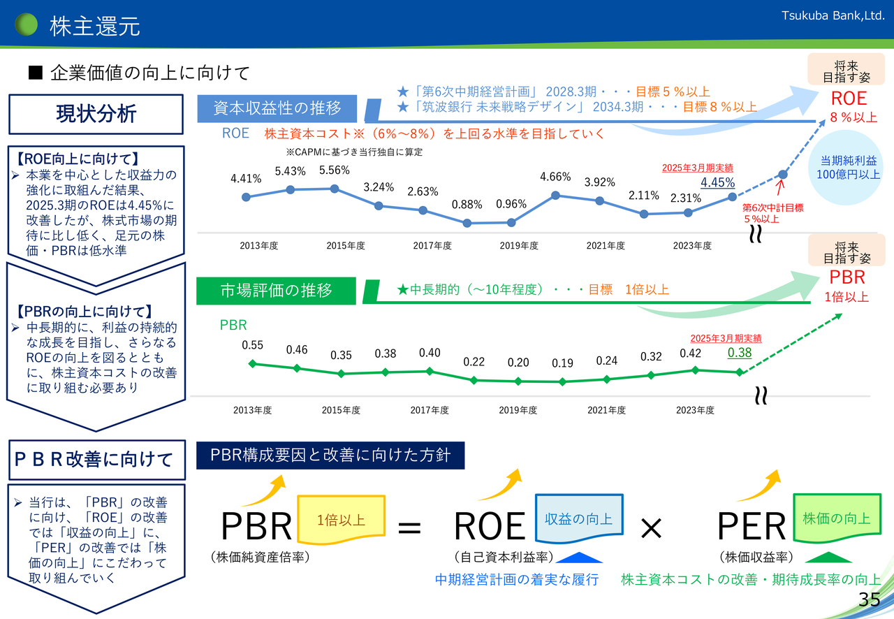 2025年3月期のROEは、本業を中心とした収益力の強化に取り組んだ結果、当期純利益の増加により、前期比2.14ポイント改善し、4.45パーセントに上昇しましたが、足元のPBRは依然として低水準にあると認識しており、PBRの向上が課題であると考えています。なお、ROEですが、直近決算である2025年9月期では、7.91パーセントに改善しています。