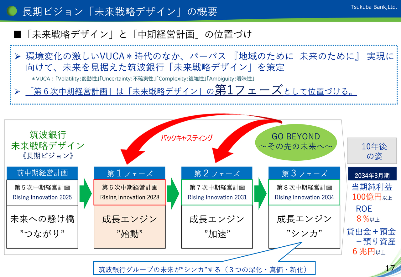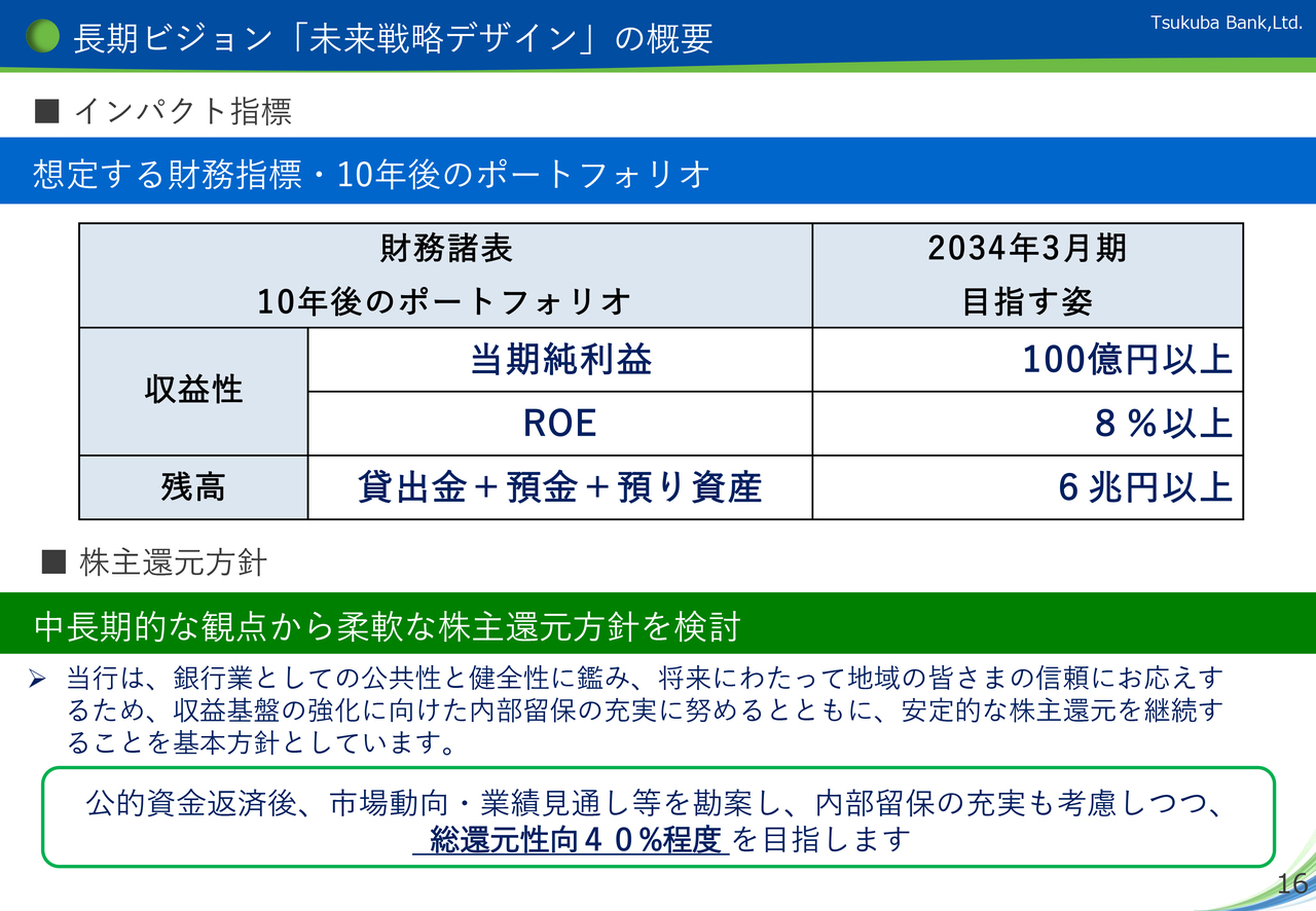 2点目として、2034年3月期をゴールとする長期ビジョン「未来戦略デザイン」では、「当期純利益100億円以上」「ROE8パーセント以上」「預金+貸出金+預り資産の合計 6兆円以上」を目指します。