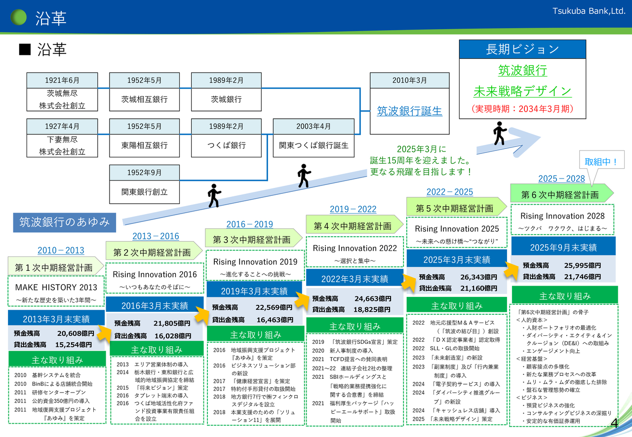 当行は2010年に「関東つくば銀行」と「茨城銀行」が合併して誕生しました。昨年で15周年を迎え、さらなる成長を目指すため、2034年3月期をゴールとする長期ビジョン「未来戦略デザイン」を策定しました。現在は「第6次中期経営計画」に取り組んでいます。この計画は、当行の未来を見据えた重要なステップであり、役職員一丸となって取り組んでいます。