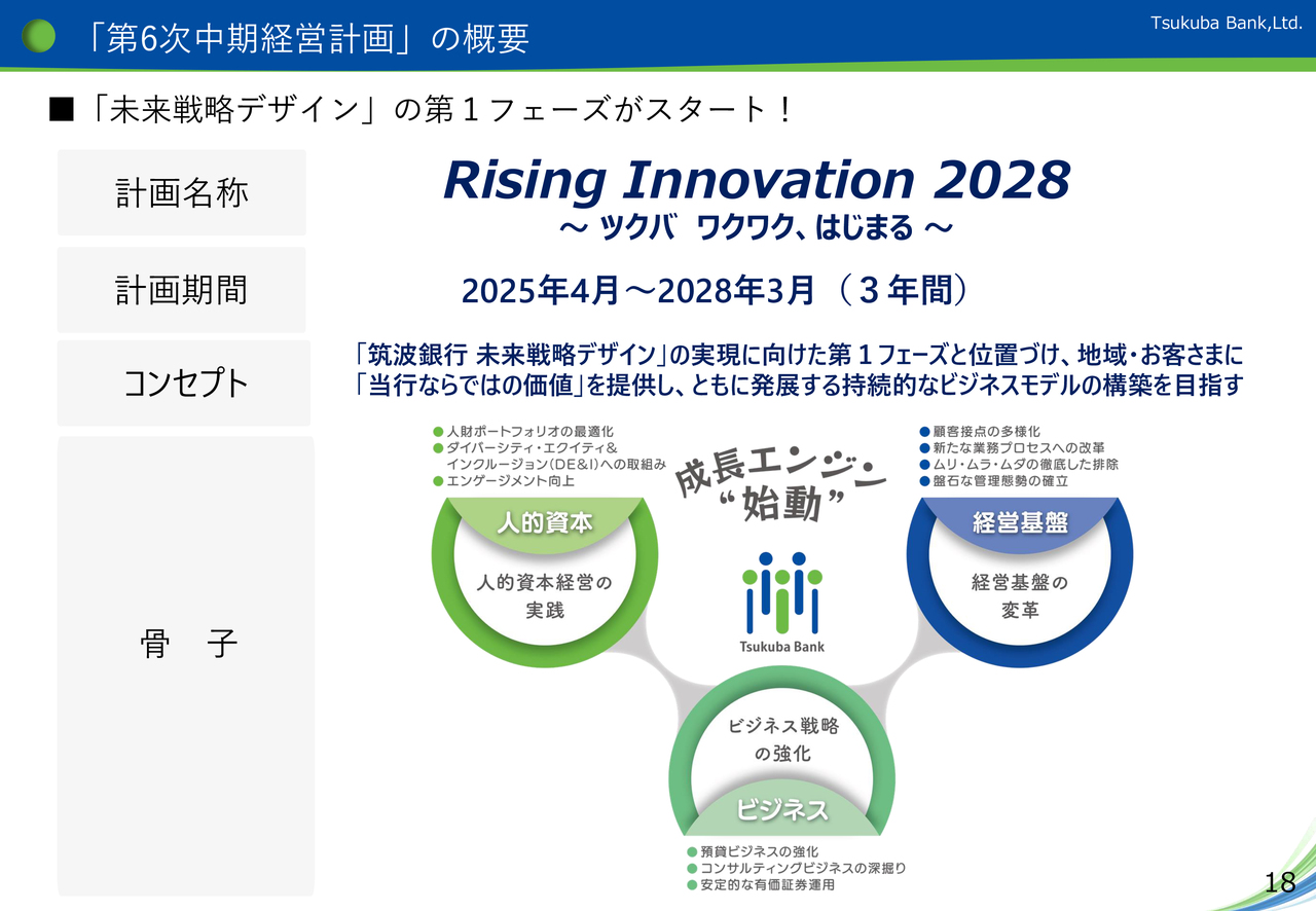 また、計画期間を2025年4月から2028年の3年間とし、コンセプトは、資料記載のとおり、地域・お客さまに「当行ならではの価値」を提供し、ともに発展する持続的なビジネスモデルの構築を目指していくものです。