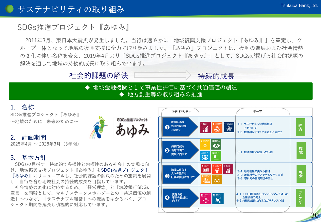 まず、資料30ページですが、当行のサステナビリティに関する取り組みの契機は、2011年3月に発生した東日本大震災です。