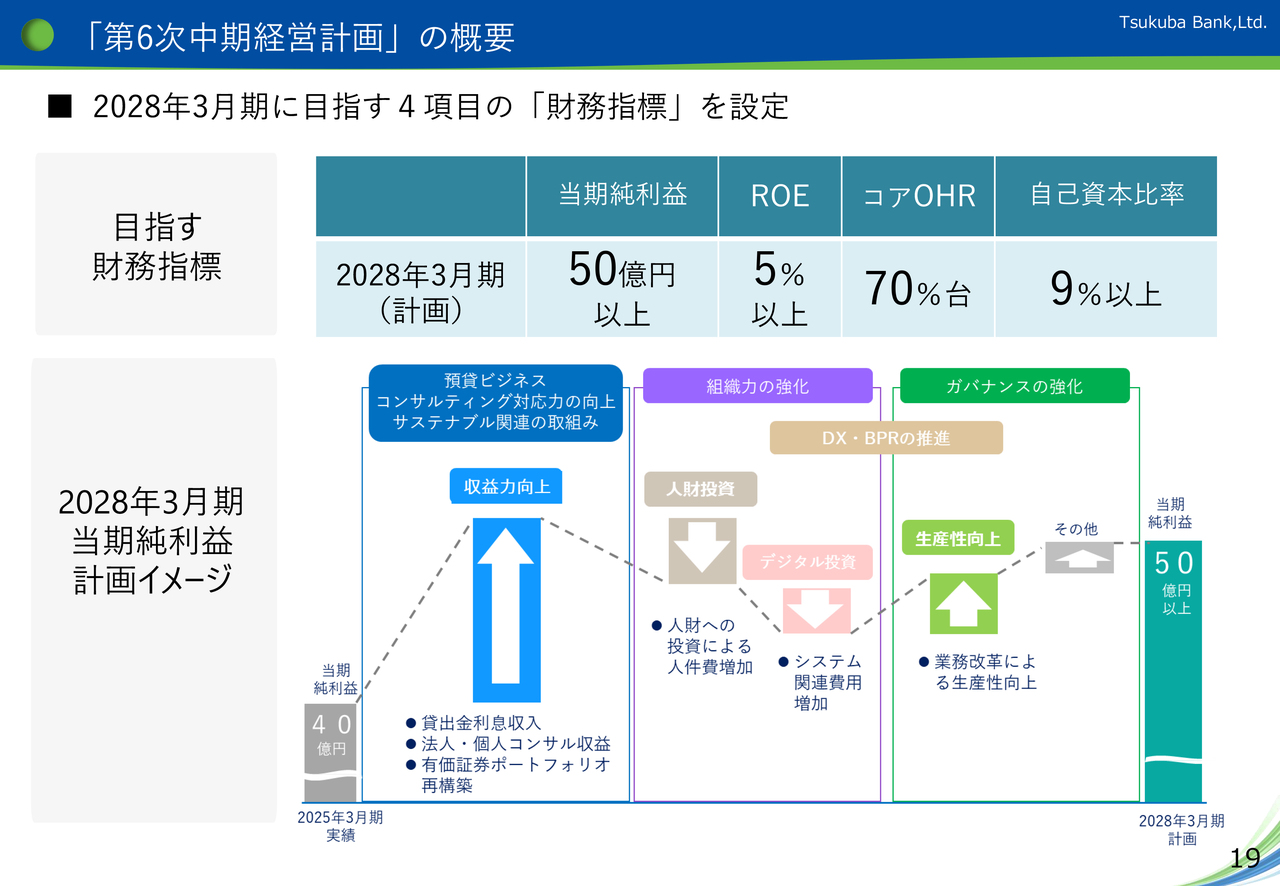 また、2028年3月期の当期純利益の計画イメージについては、資料19ページ記載のとおり、預貸ビジネスや、法人・個人コンサルなどの強化により収益力を向上させるとともに、並行して、人財およびデジタル分野への投資により生産性を向上させることにより、2028年3月期の当期純利益50億円以上を目指していきます。 右下20ページをご覧ください。