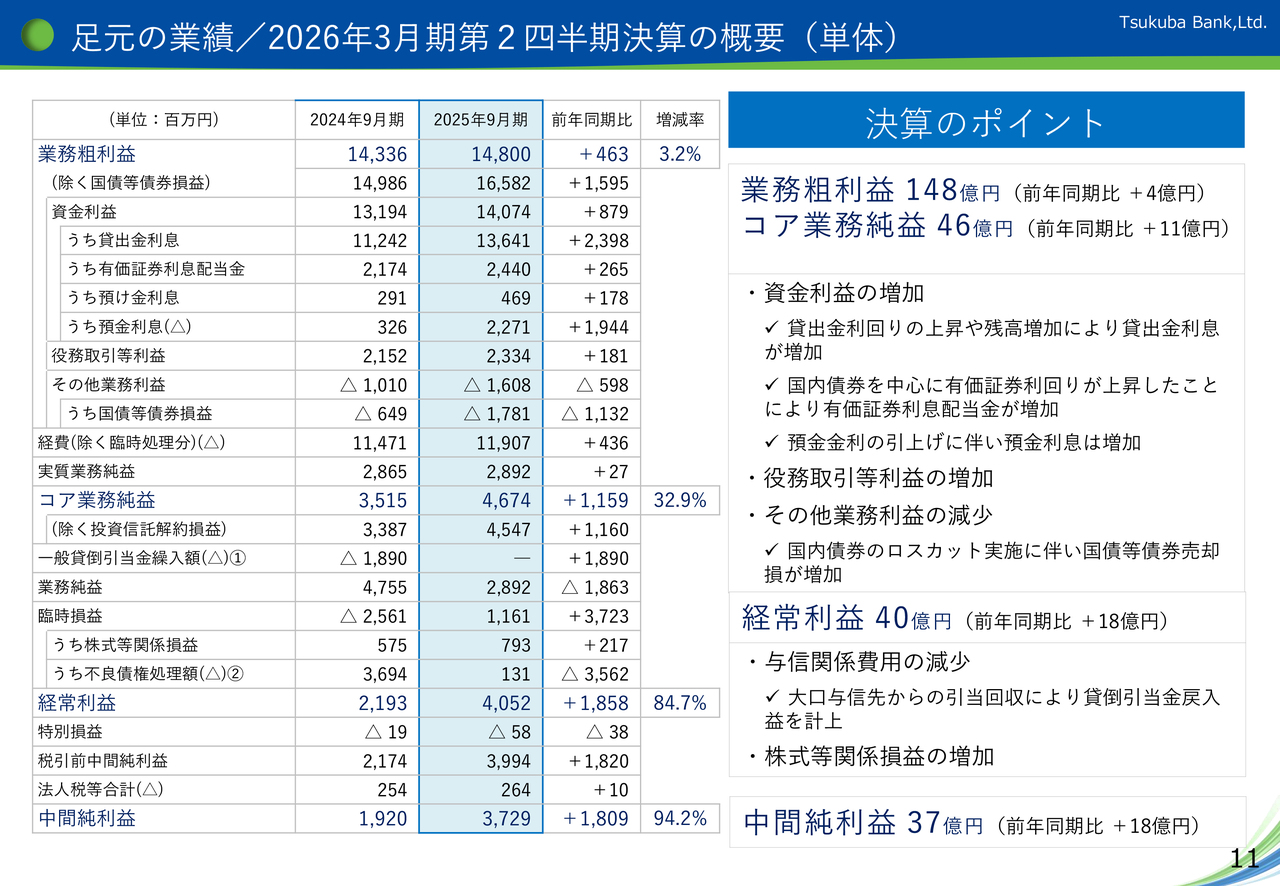 また、本業の収益力を示す「コア業務純益」については、「貸出金利息」を中心とした「資金利益」の増加を主因に前年同期比11億円増加の46億円となり、収益力の改善が続いています。