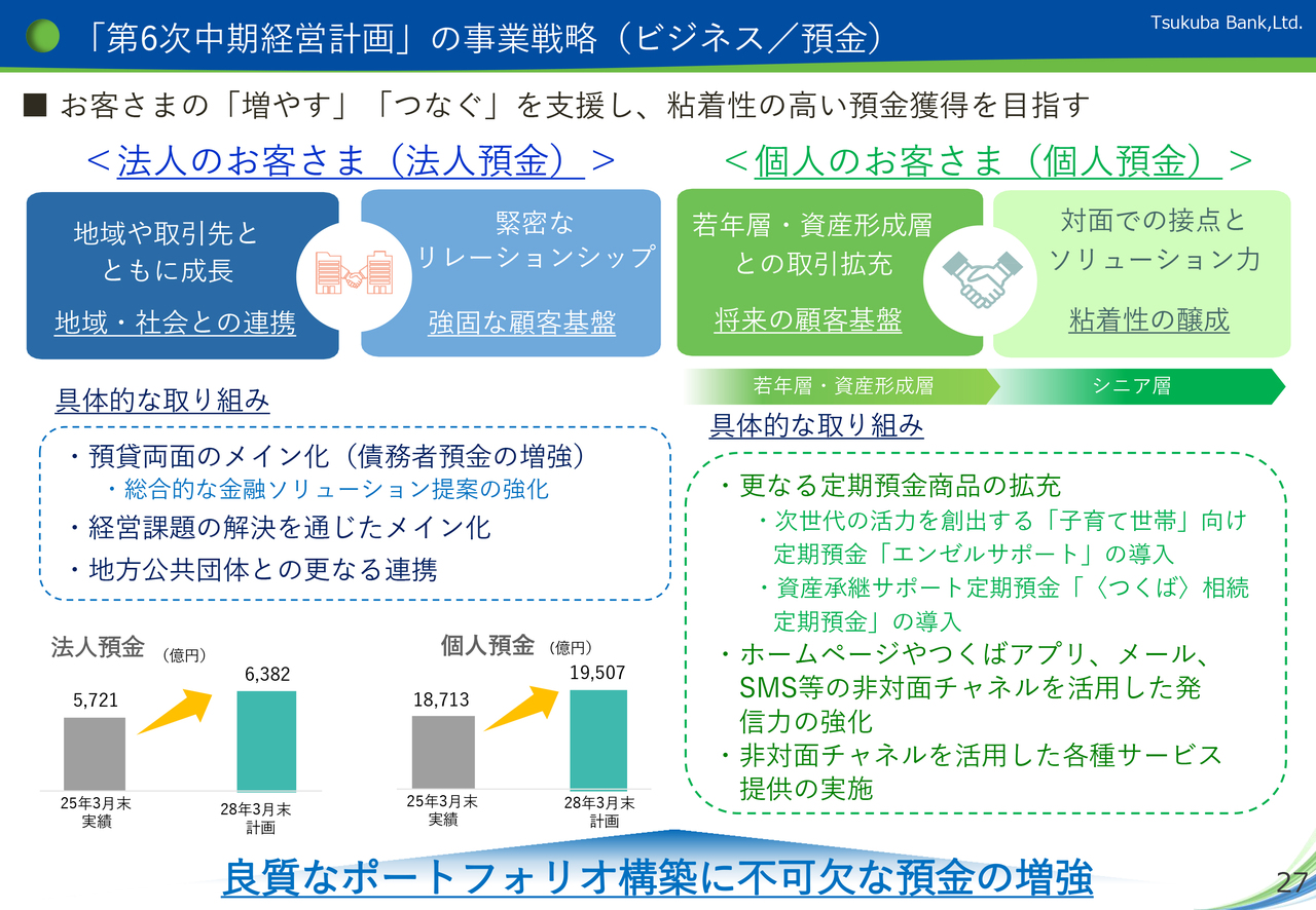 「金利ある世界」の到来により従来以上に預金調達が重要になっていることを踏まえ、預金獲得に向けた推進体制を強化するとともに、非対面チャネルも活用する中で、お客さまの「増やす」「つなぐ」を支援し、法人預金および個人預金ともに粘着性の高い預金の獲得を目指していきます。