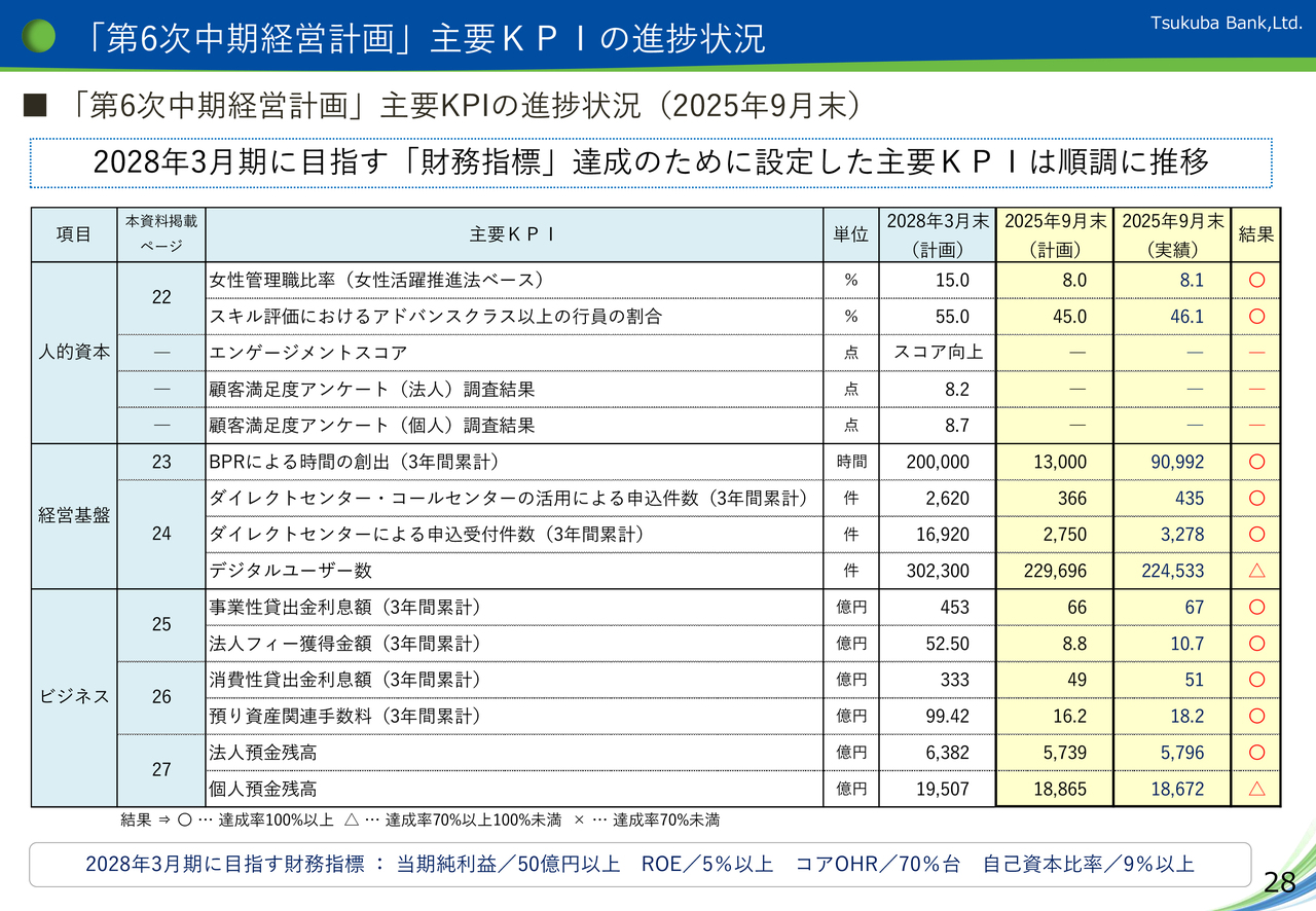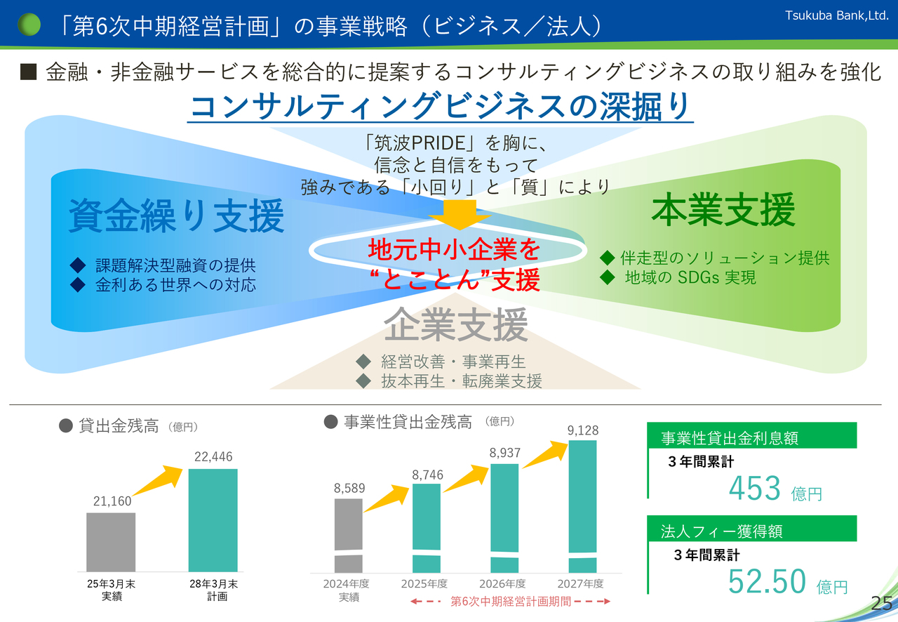 貸出金残高の増加目標は資料下段に記載していますが、事業性貸出残高については、中計最終期の残高を9,128億円としています。また、KPIとして事業性貸出金利息額を3年間累計で453億円、法人フィー獲得額を52.5億円としています。