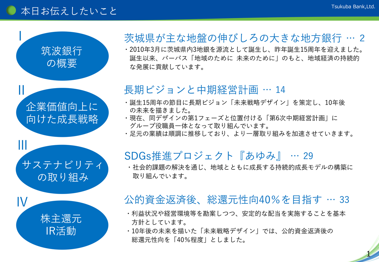 まず、1点目として、当行の概要について、次に、2点目として、長期ビジョン「未来戦略デザイン」と「第6次中期経営計画」の事業戦略、3点目は「サステナビリティの取り組み」について、 そして最後に、株主さまへの還元方針等についてです。