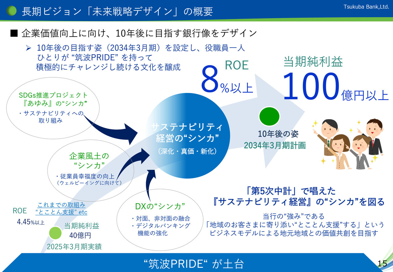 長期ビジョン「未来戦略デザイン」では、役職員の熱意(筑波PRIDE)と当行の強みである「小回り」と「質」によるお客さま支援を実践し、茨城県の持続的発展に貢献することを目指しています。